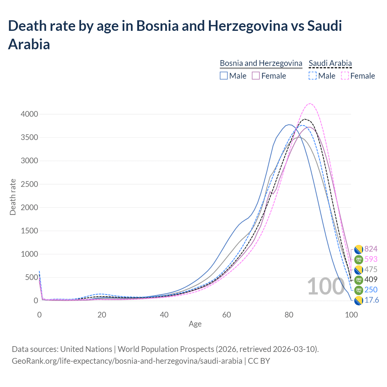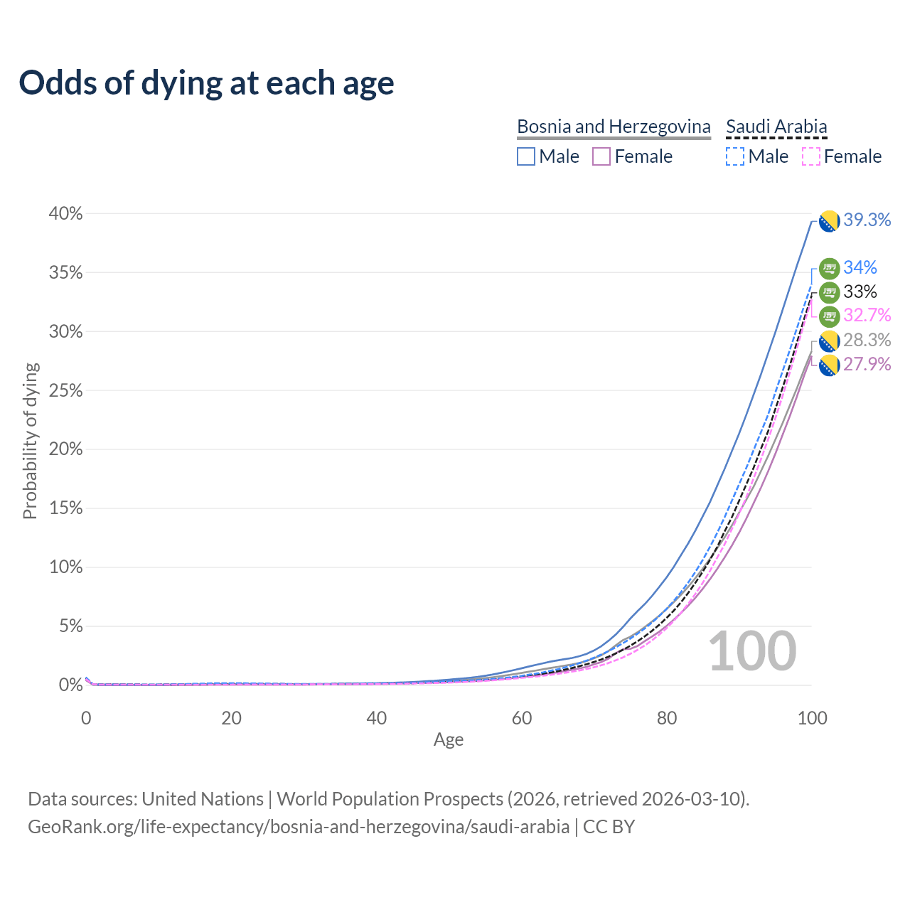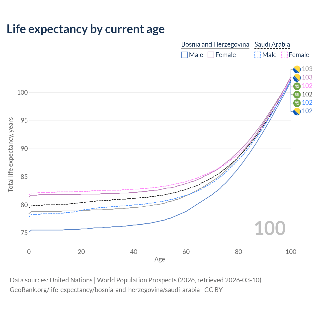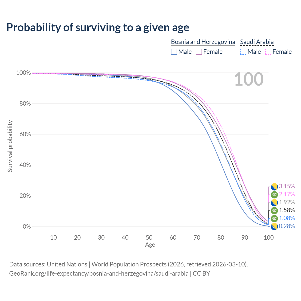 This life expectancy calculator shows the odds of living to 100, 95, 90, and below based on current age for both males and females in Bosnia and Herzegovina and Saudi Arabia, along with mean and median age of death. The calculations are based on the 2026 life tables (actuarial tables) from the UN World Population Prospects.