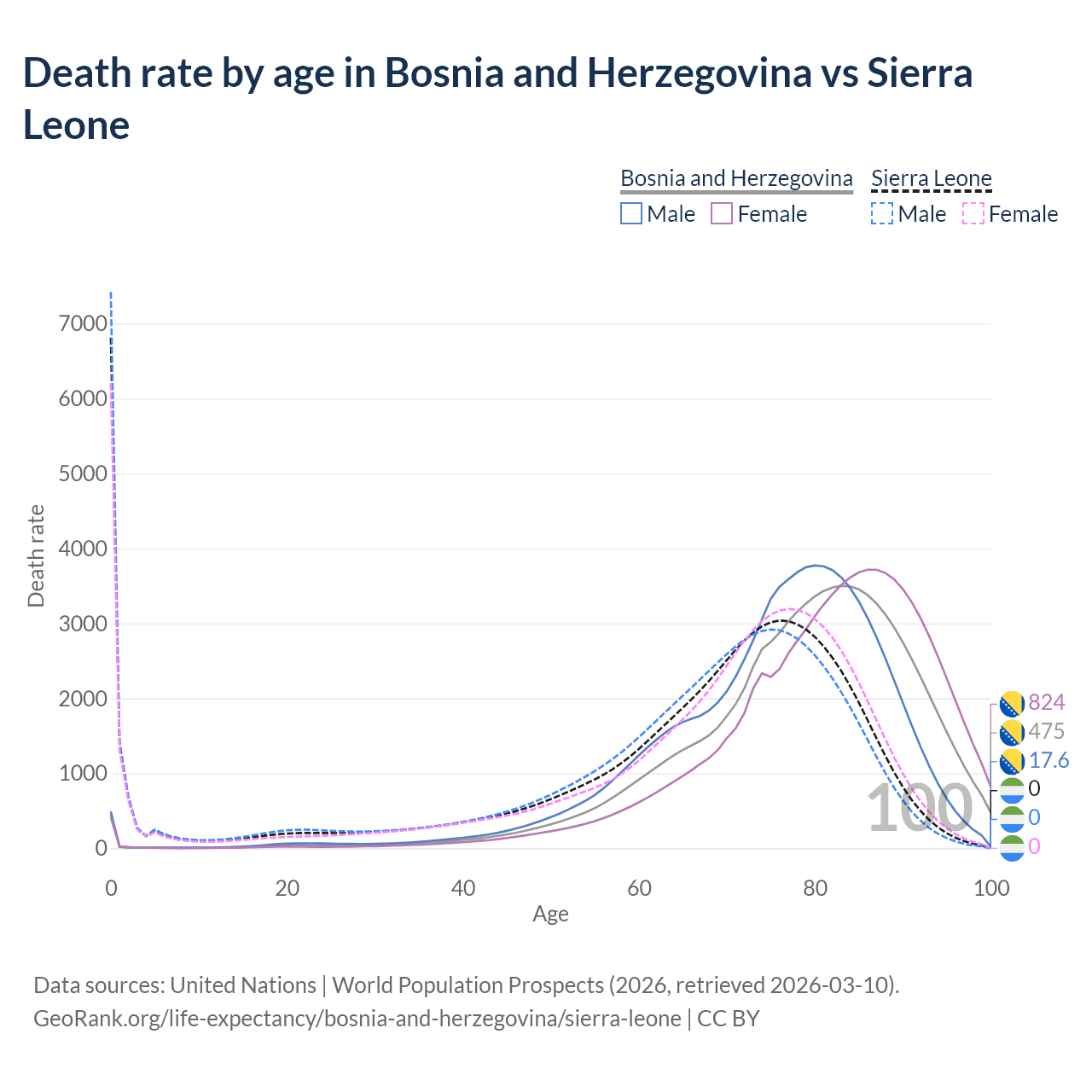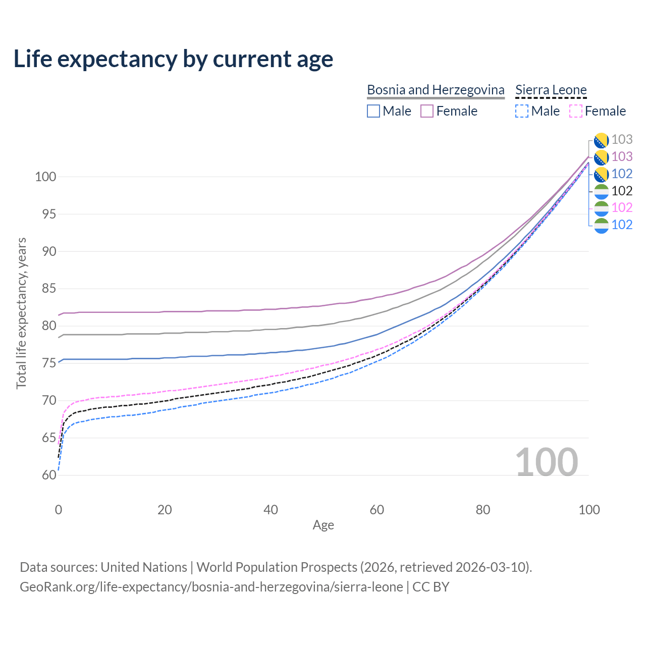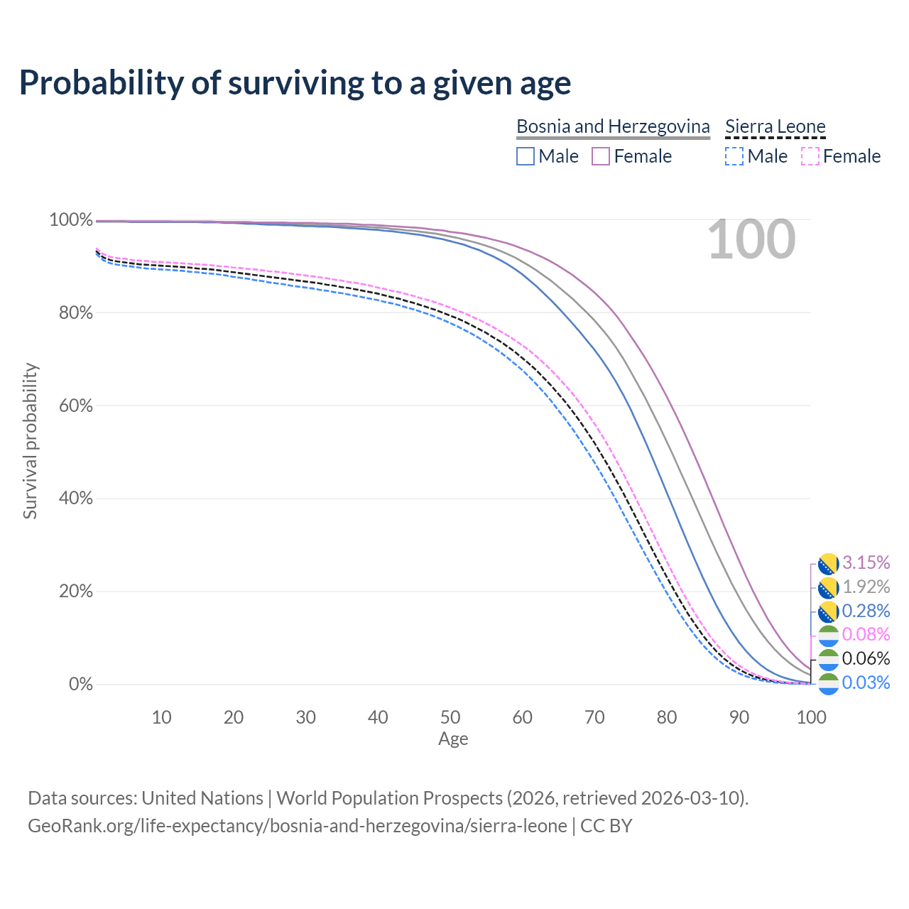 This life expectancy calculator shows the odds of living to 100, 95, 90, and below based on current age for both males and females in Bosnia and Herzegovina and Sierra Leone, along with mean and median age of death. The calculations are based on the 2026 life tables (actuarial tables) from the UN World Population Prospects.