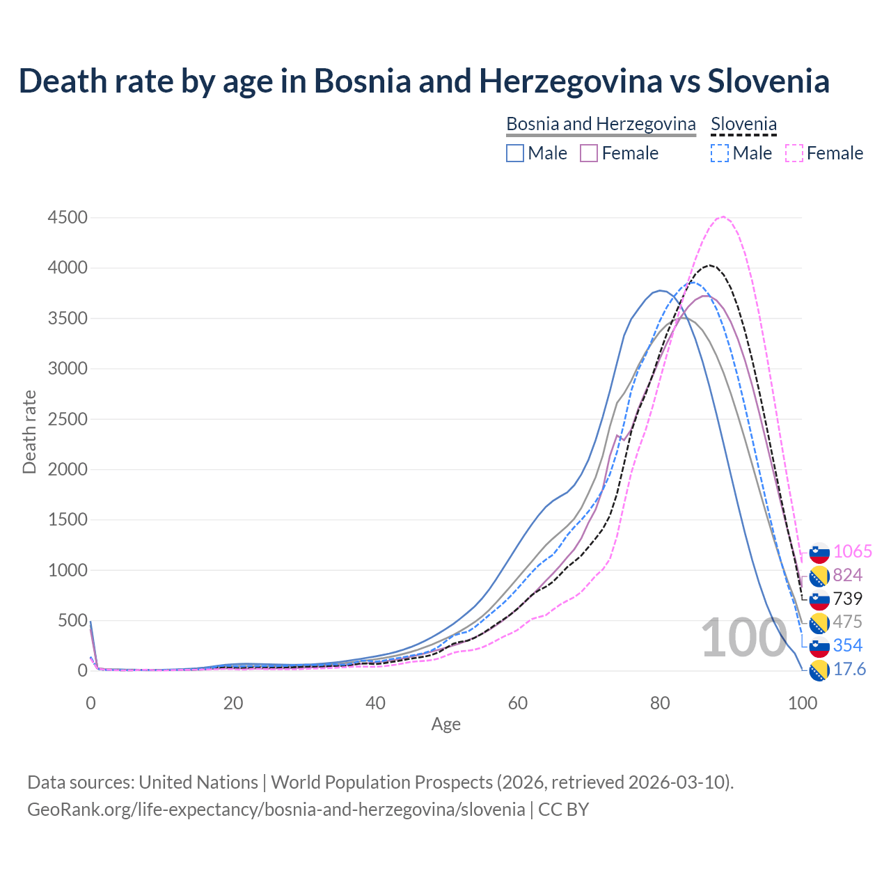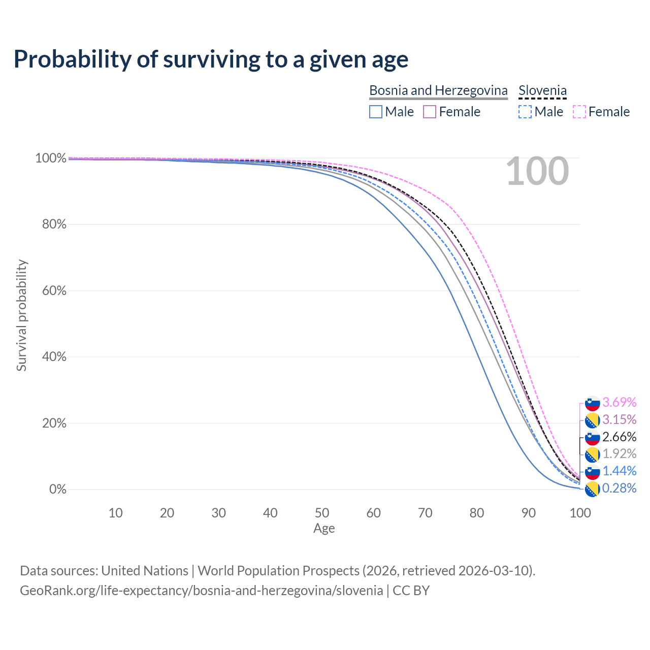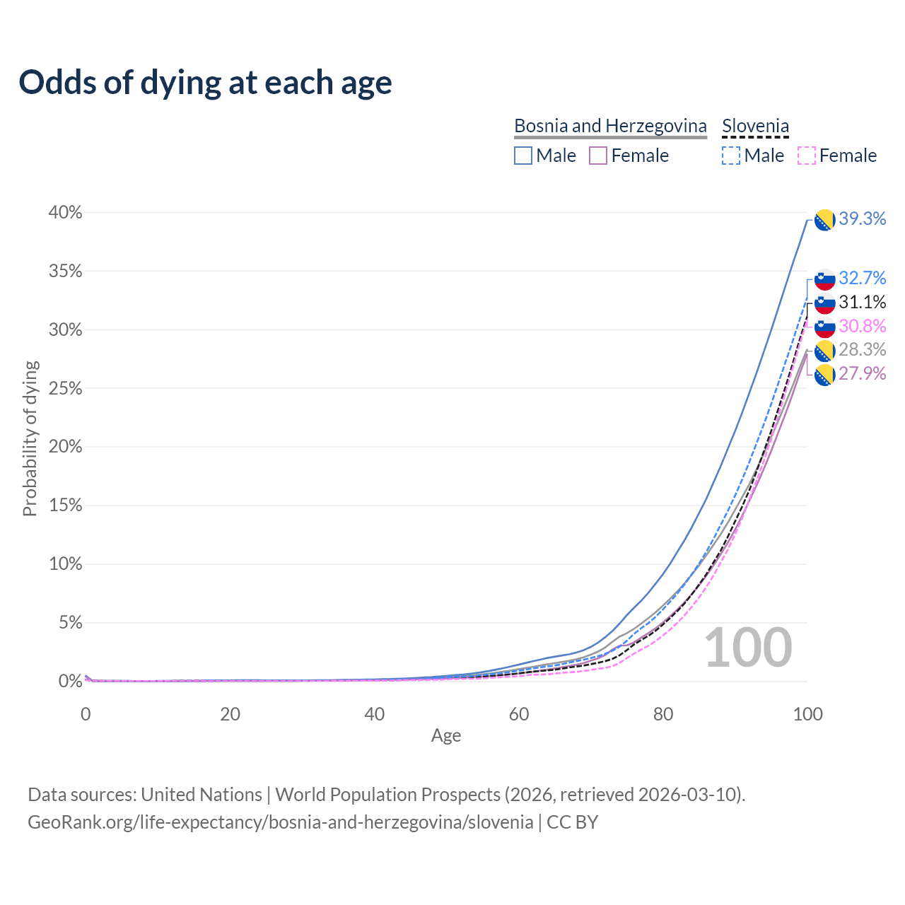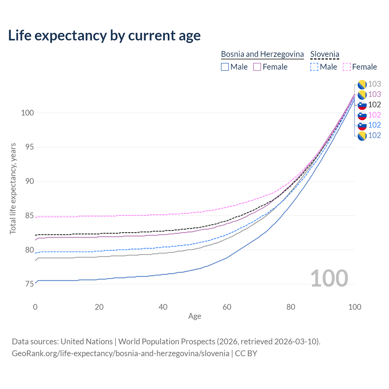 This life expectancy calculator shows the odds of living to 100, 95, 90, and below based on current age for both males and females in Bosnia and Herzegovina and Slovenia, along with mean and median age of death. The calculations are based on the 2026 life tables (actuarial tables) from the UN World Population Prospects.