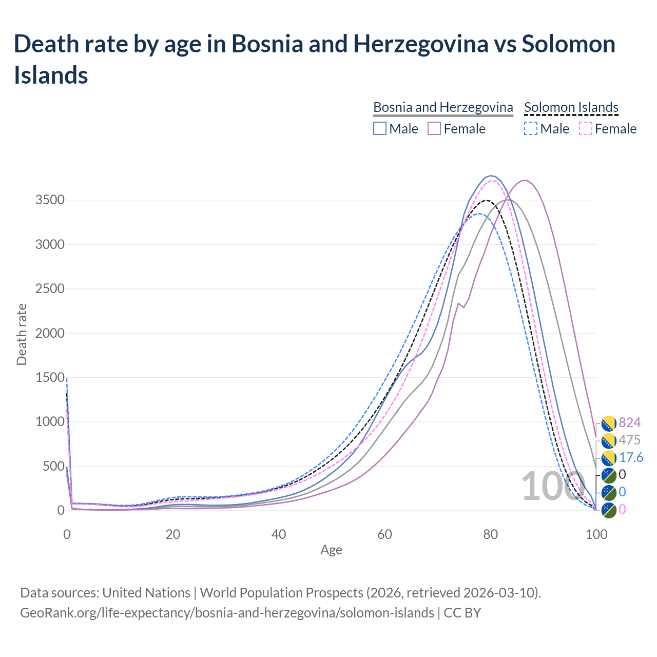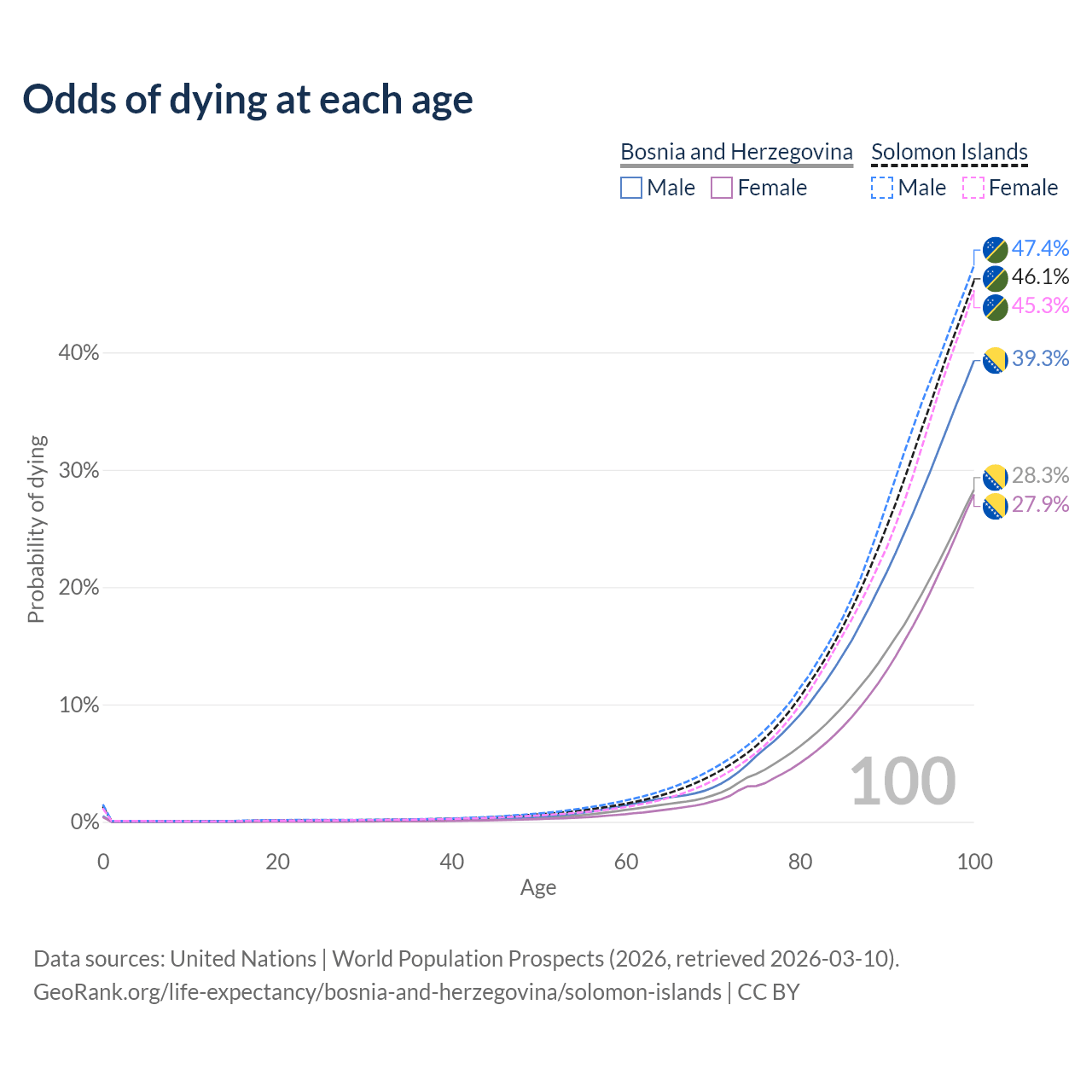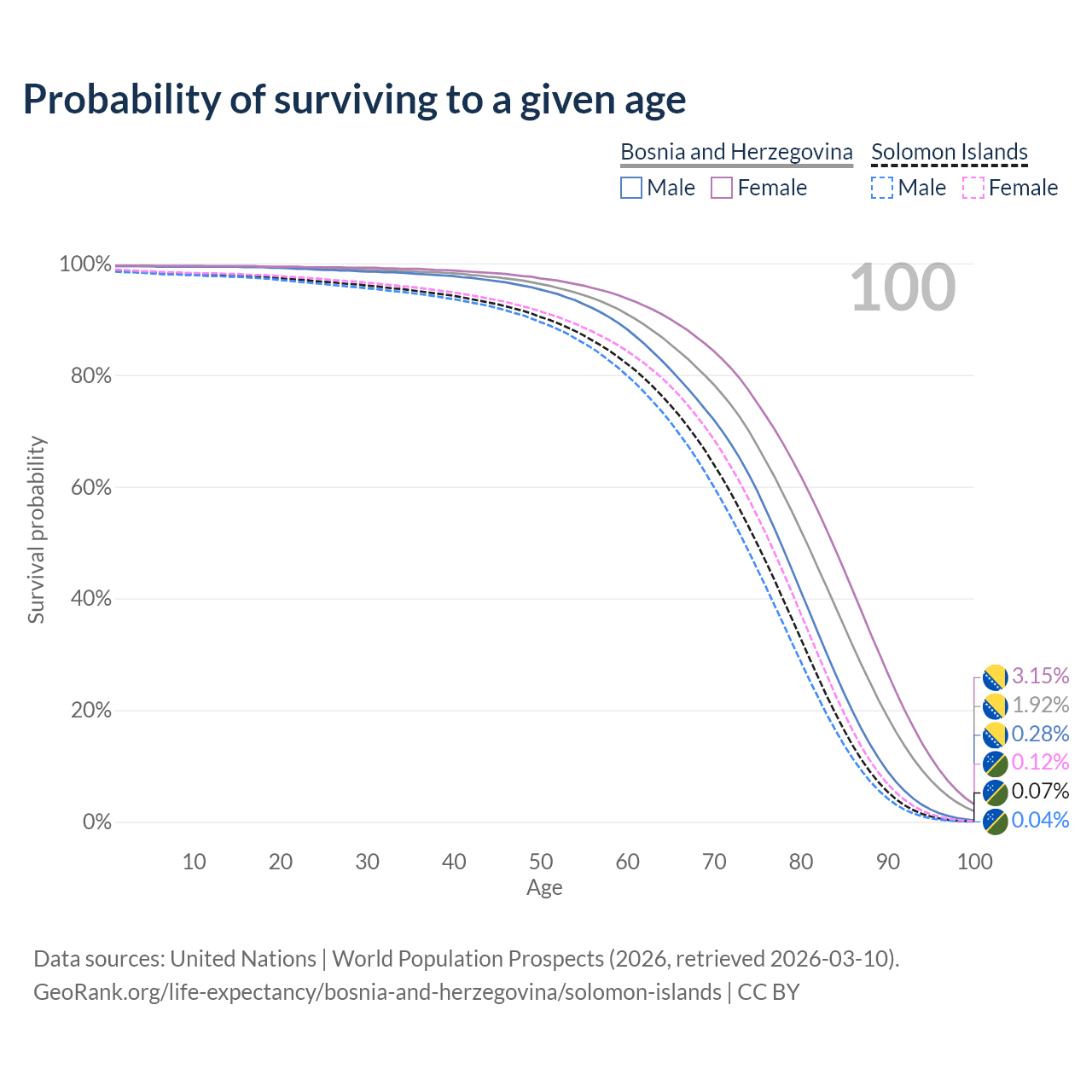 This life expectancy calculator shows the odds of living to 100, 95, 90, and below based on current age for both males and females in Bosnia and Herzegovina and the Solomon Islands, along with mean and median age of death. The calculations are based on the 2026 life tables (actuarial tables) from the UN World Population Prospects.