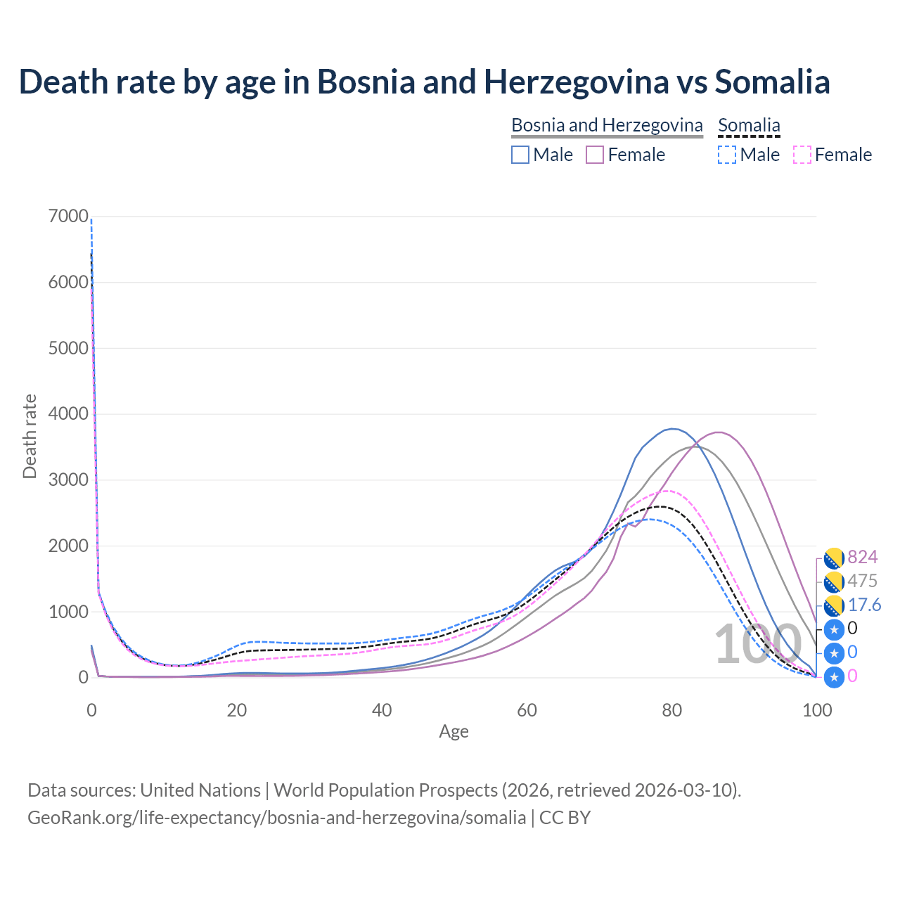 In Bosnia and Herzegovina, the most common age of death is 83, compared to 0 in Somalia. The median age of death is 80.7 in Bosnia and Herzegovina and 69 in Somalia, meaning only half of each cohort is expected to live past that age.