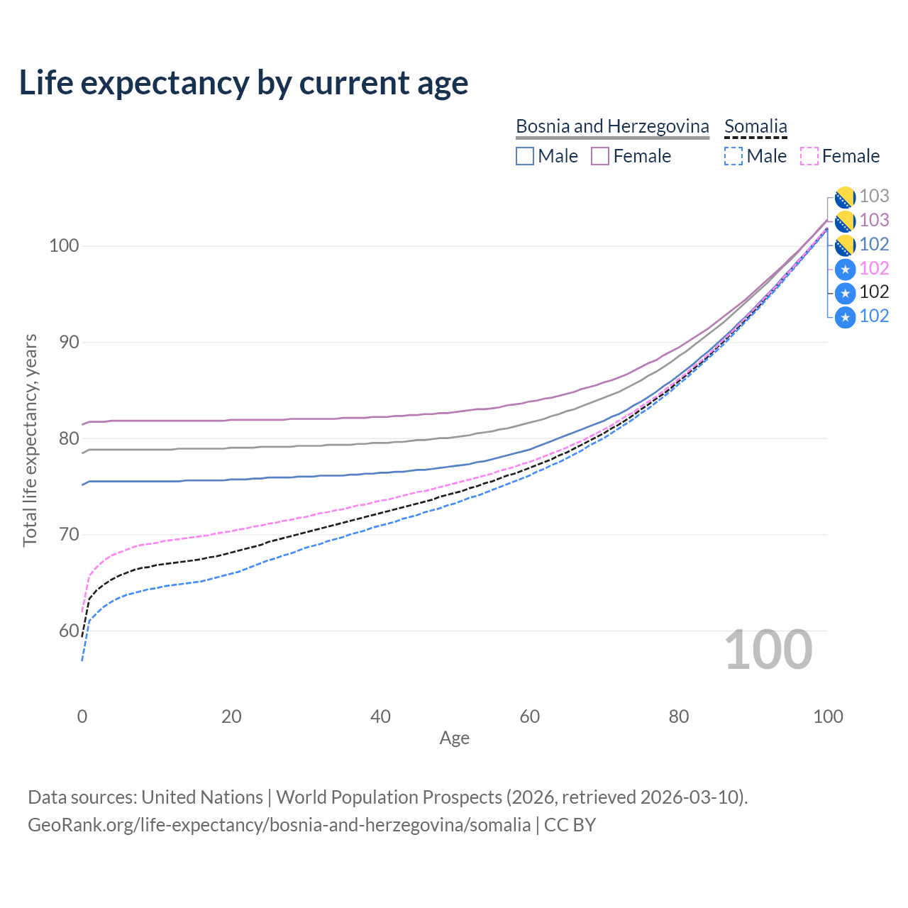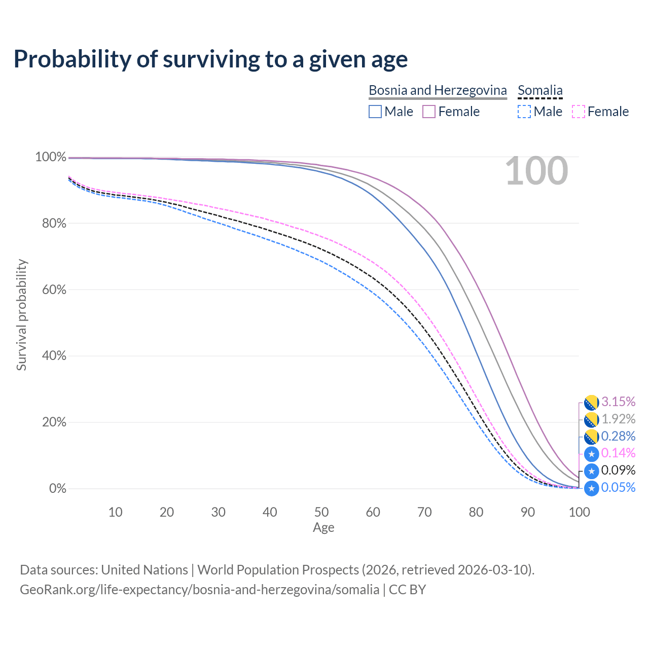 This life expectancy calculator shows the odds of living to 100, 95, 90, and below based on current age for both males and females in Bosnia and Herzegovina and Somalia, along with mean and median age of death. The calculations are based on the 2026 life tables (actuarial tables) from the UN World Population Prospects.