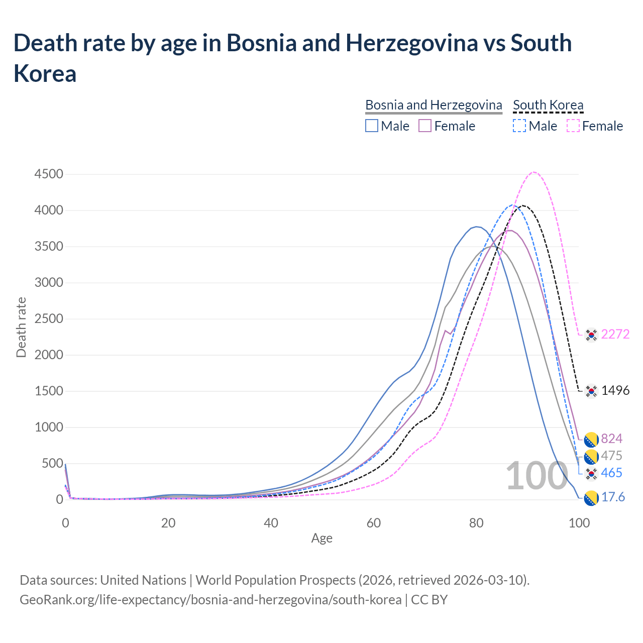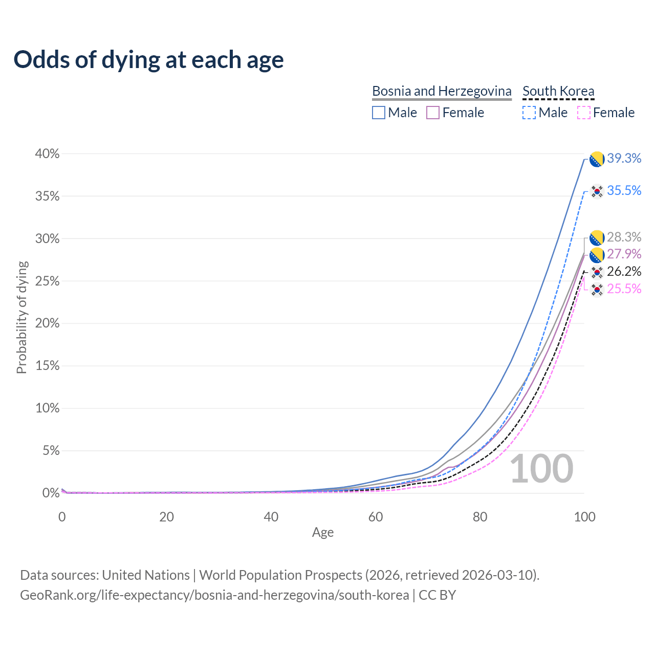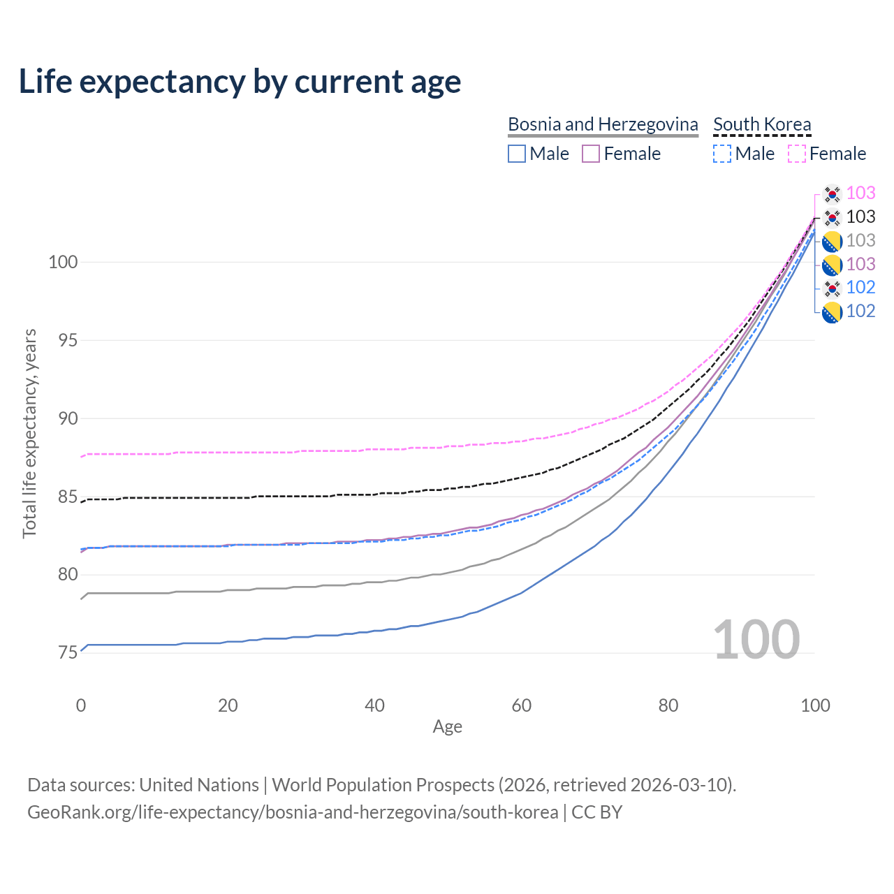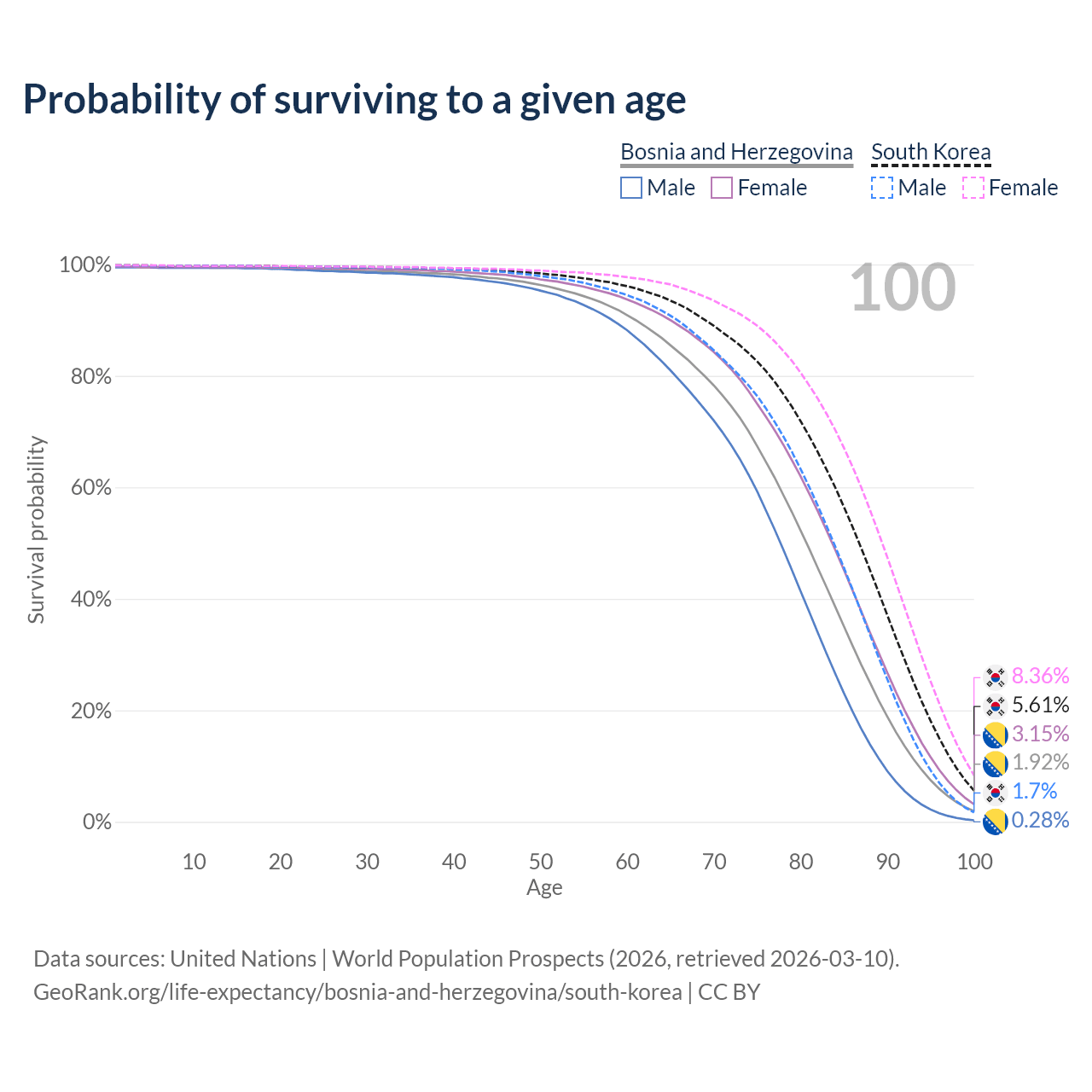 This life expectancy calculator shows the odds of living to 100, 95, 90, and below based on current age for both males and females in Bosnia and Herzegovina and South Korea, along with mean and median age of death. The calculations are based on the 2026 life tables (actuarial tables) from the UN World Population Prospects.
