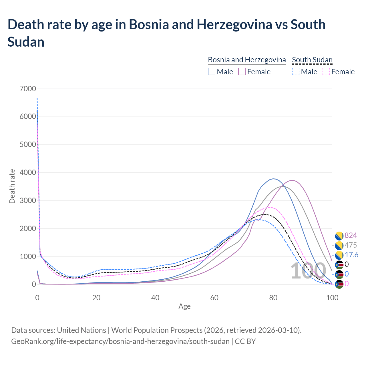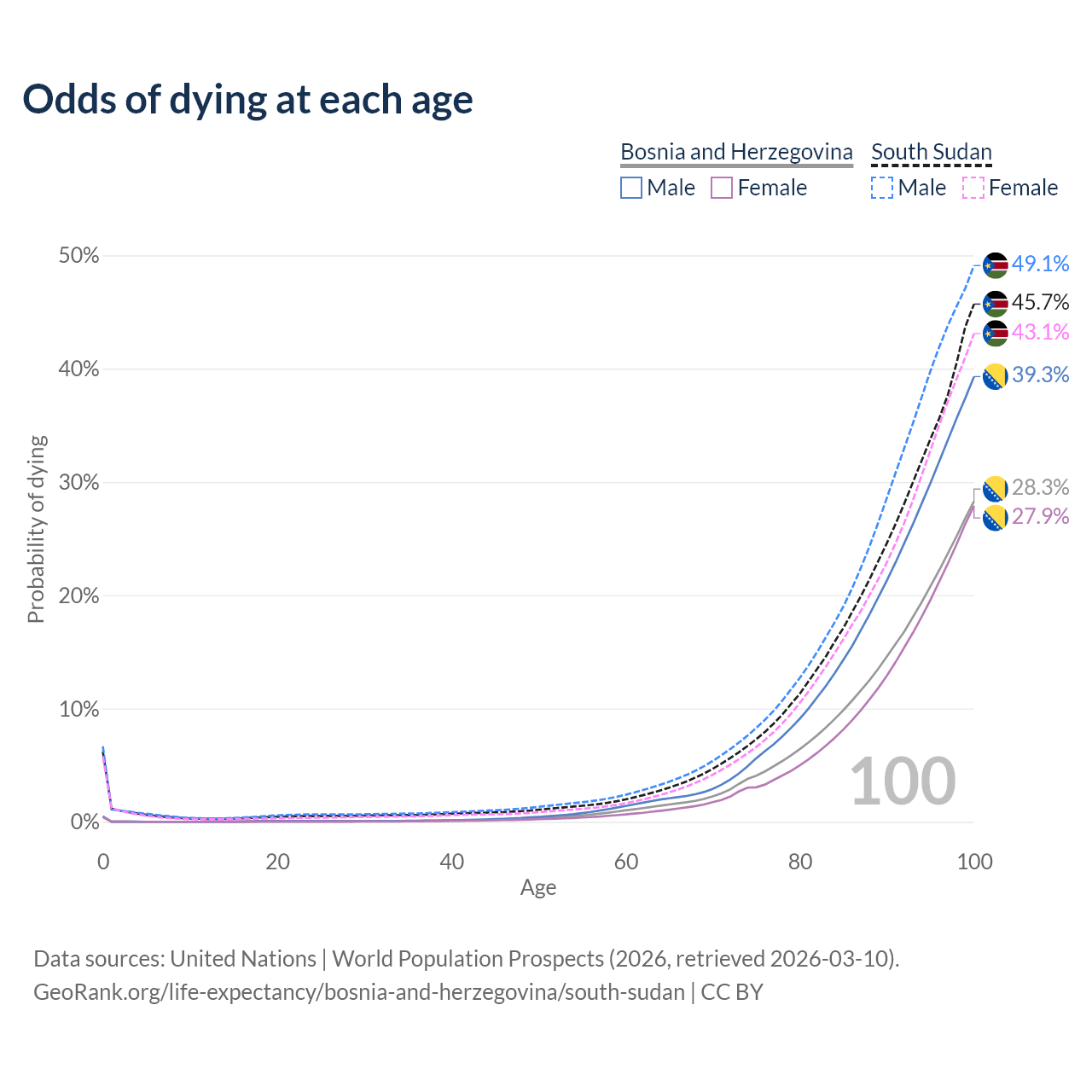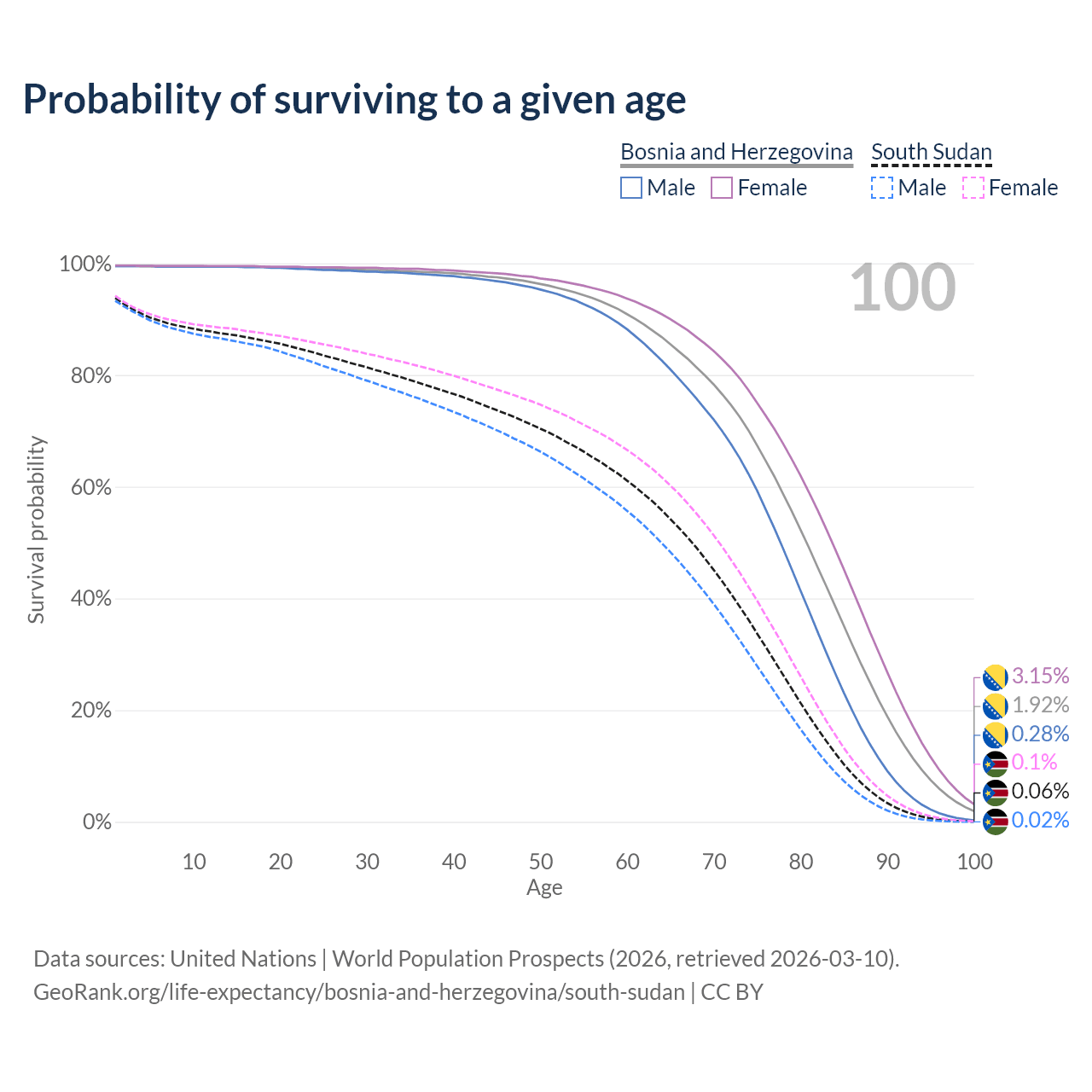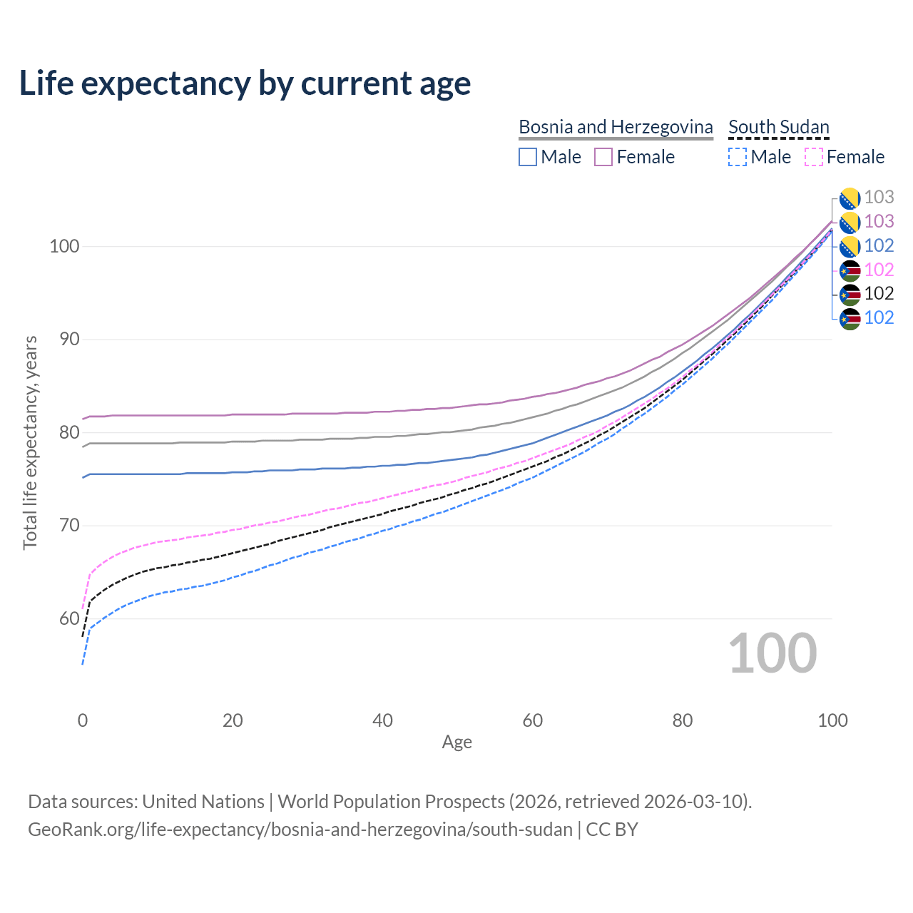 This life expectancy calculator shows the odds of living to 100, 95, 90, and below based on current age for both males and females in Bosnia and Herzegovina and South Sudan, along with mean and median age of death. The calculations are based on the 2026 life tables (actuarial tables) from the UN World Population Prospects.