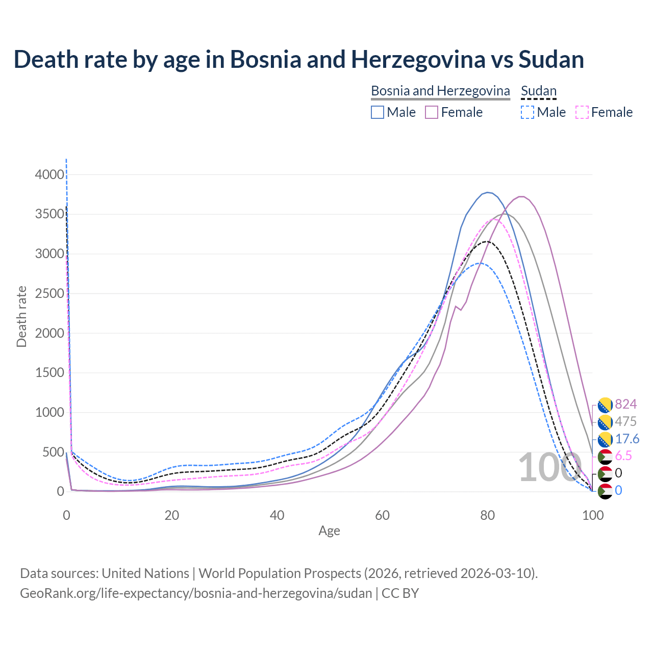 In Bosnia and Herzegovina, the most common age of death is 83, compared to 0 in Sudan. The median age of death is 80.7 in Bosnia and Herzegovina and 74.1 in Sudan, meaning only half of each cohort is expected to live past that age.