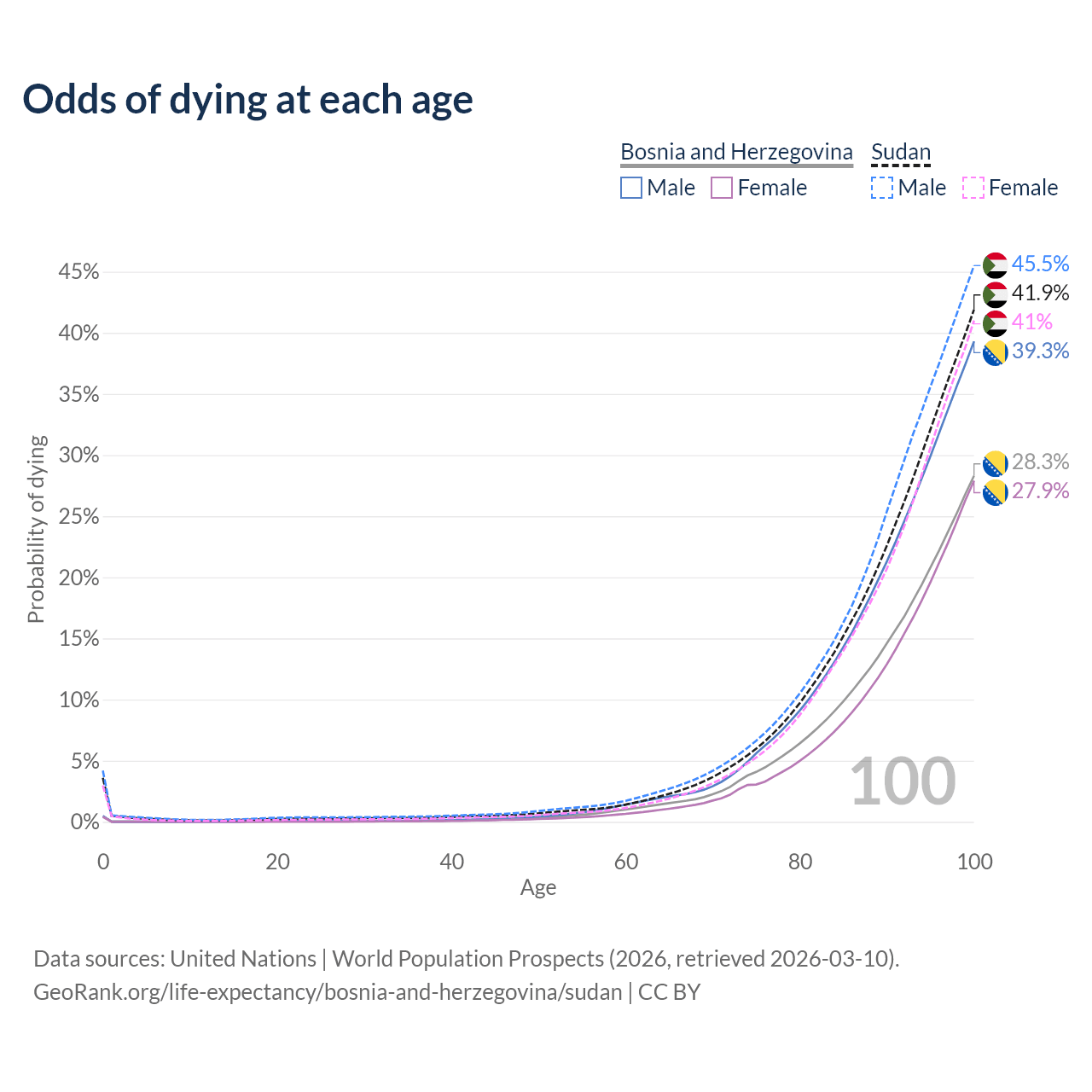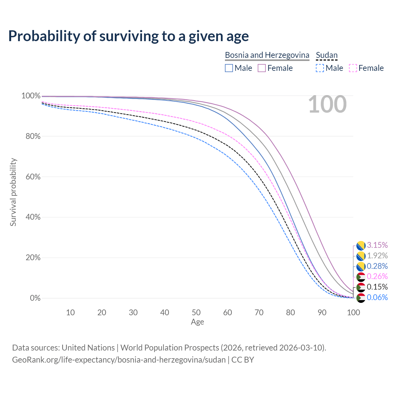 This life expectancy calculator shows the odds of living to 100, 95, 90, and below based on current age for both males and females in Bosnia and Herzegovina and Sudan, along with mean and median age of death. The calculations are based on the 2026 life tables (actuarial tables) from the UN World Population Prospects.