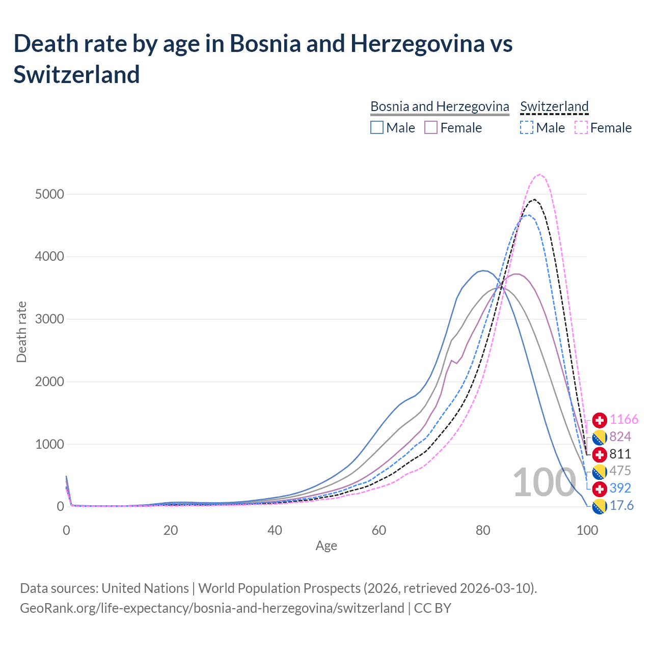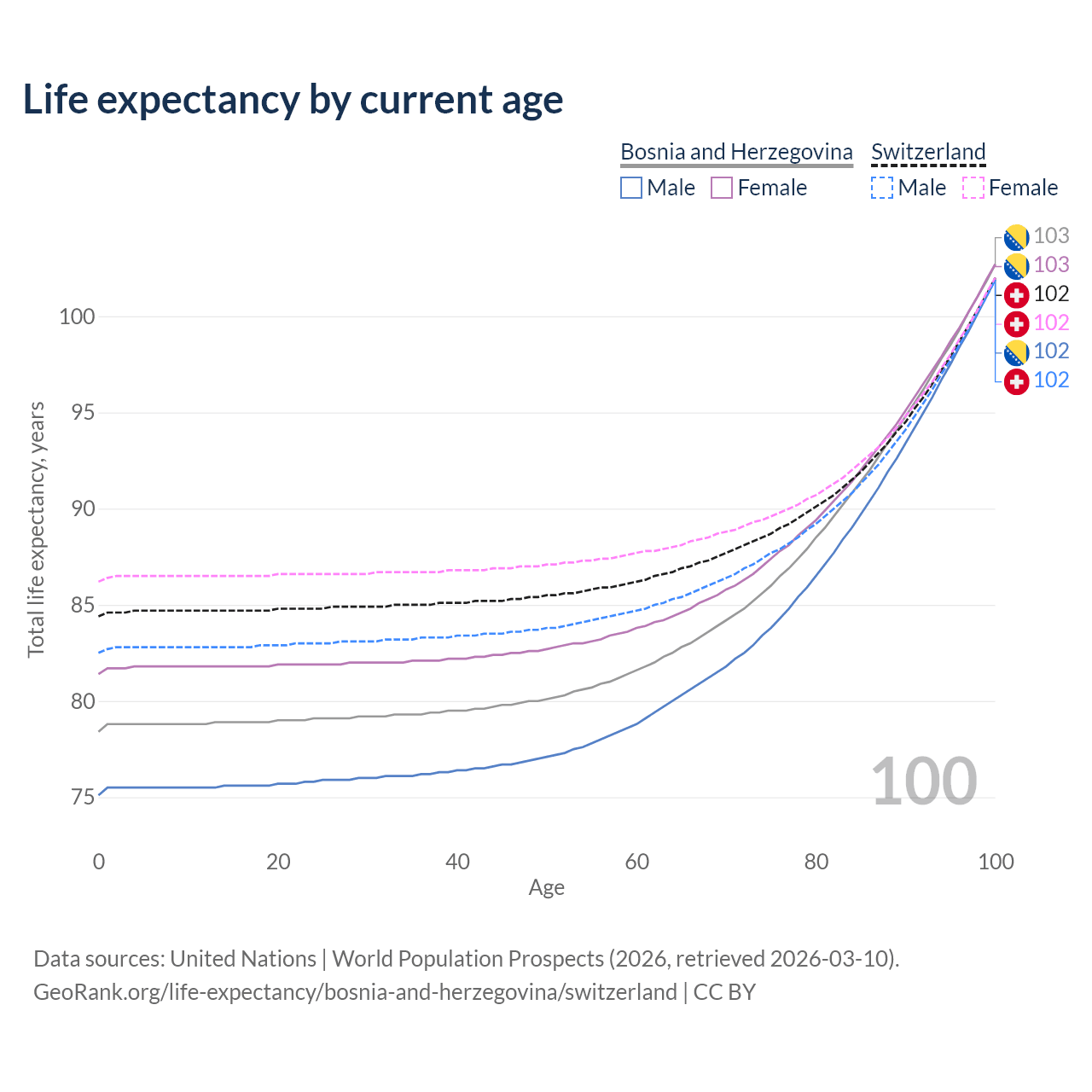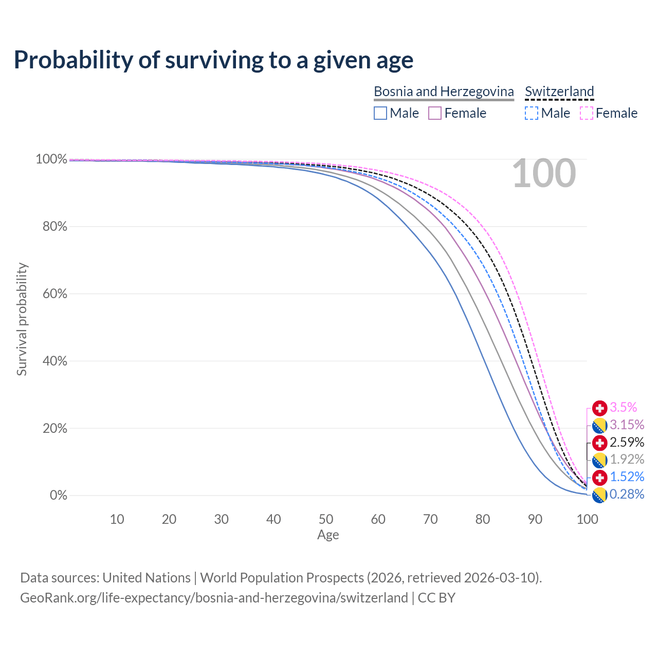 This life expectancy calculator shows the odds of living to 100, 95, 90, and below based on current age for both males and females in Bosnia and Herzegovina and Switzerland, along with mean and median age of death. The calculations are based on the 2026 life tables (actuarial tables) from the UN World Population Prospects.