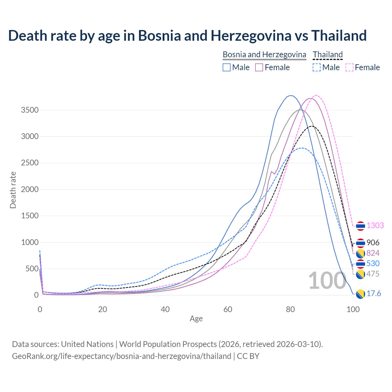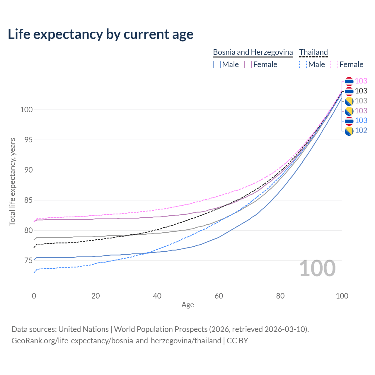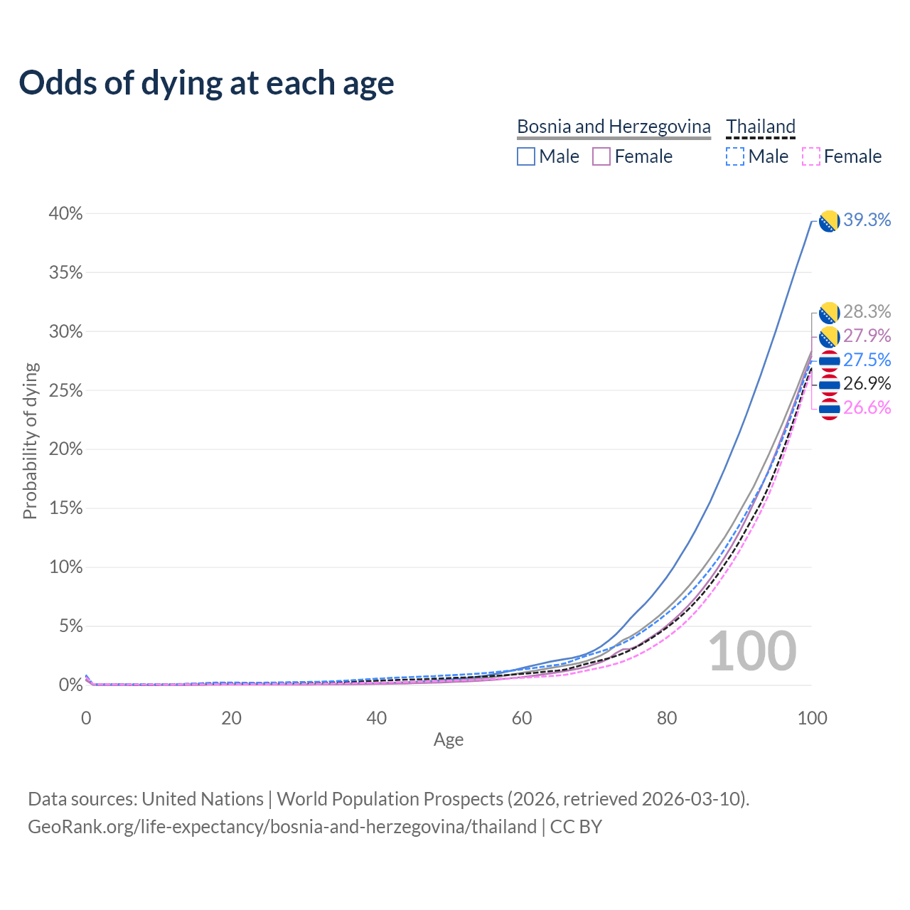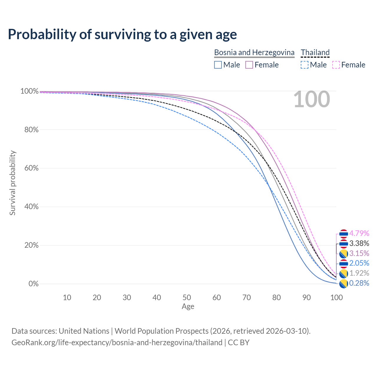 This life expectancy calculator shows the odds of living to 100, 95, 90, and below based on current age for both males and females in Bosnia and Herzegovina and Thailand, along with mean and median age of death. The calculations are based on the 2026 life tables (actuarial tables) from the UN World Population Prospects.