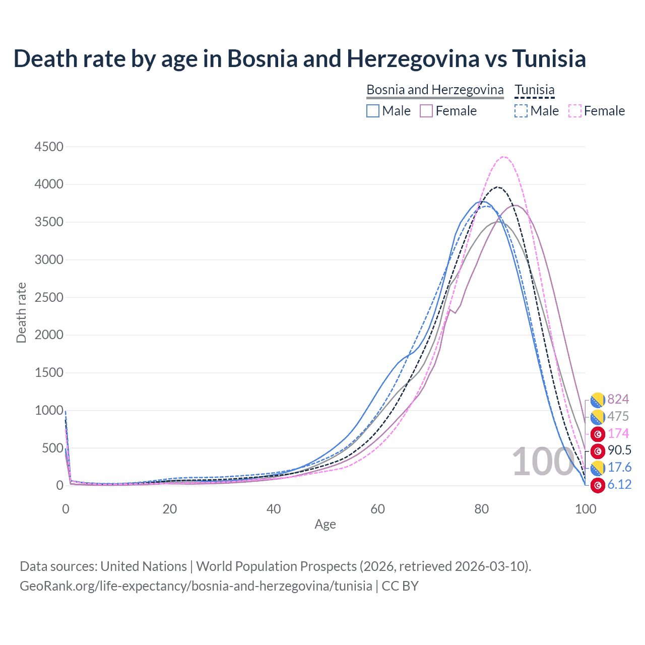 In Bosnia and Herzegovina, the most common age of death is 83, compared to 83 in Tunisia. The median age of death is 80.7 in Bosnia and Herzegovina and 80.2 in Tunisia, meaning only half of each cohort is expected to live past that age.