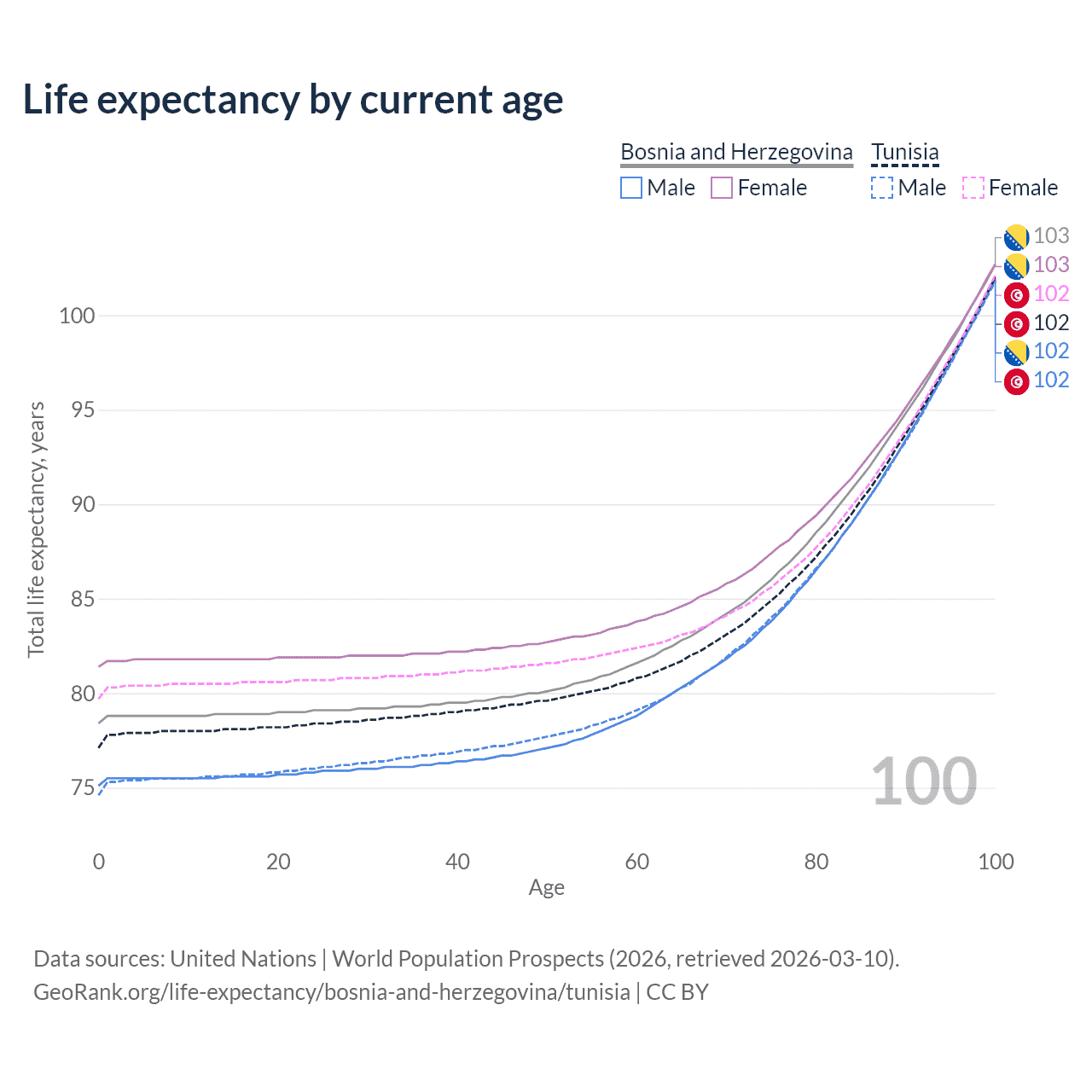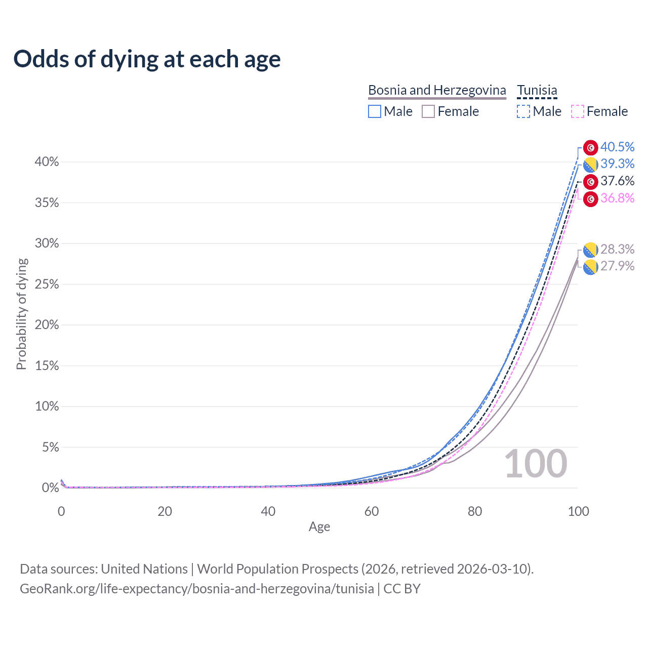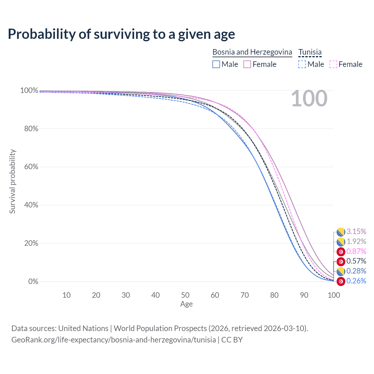 This life expectancy calculator shows the odds of living to 100, 95, 90, and below based on current age for both males and females in Bosnia and Herzegovina and Tunisia, along with mean and median age of death. The calculations are based on the 2026 life tables (actuarial tables) from the UN World Population Prospects.
