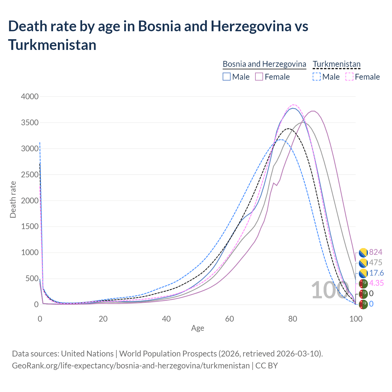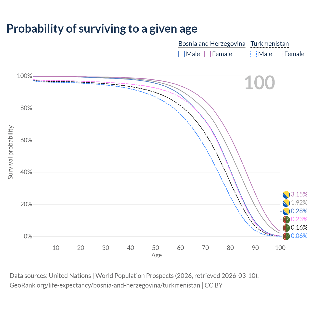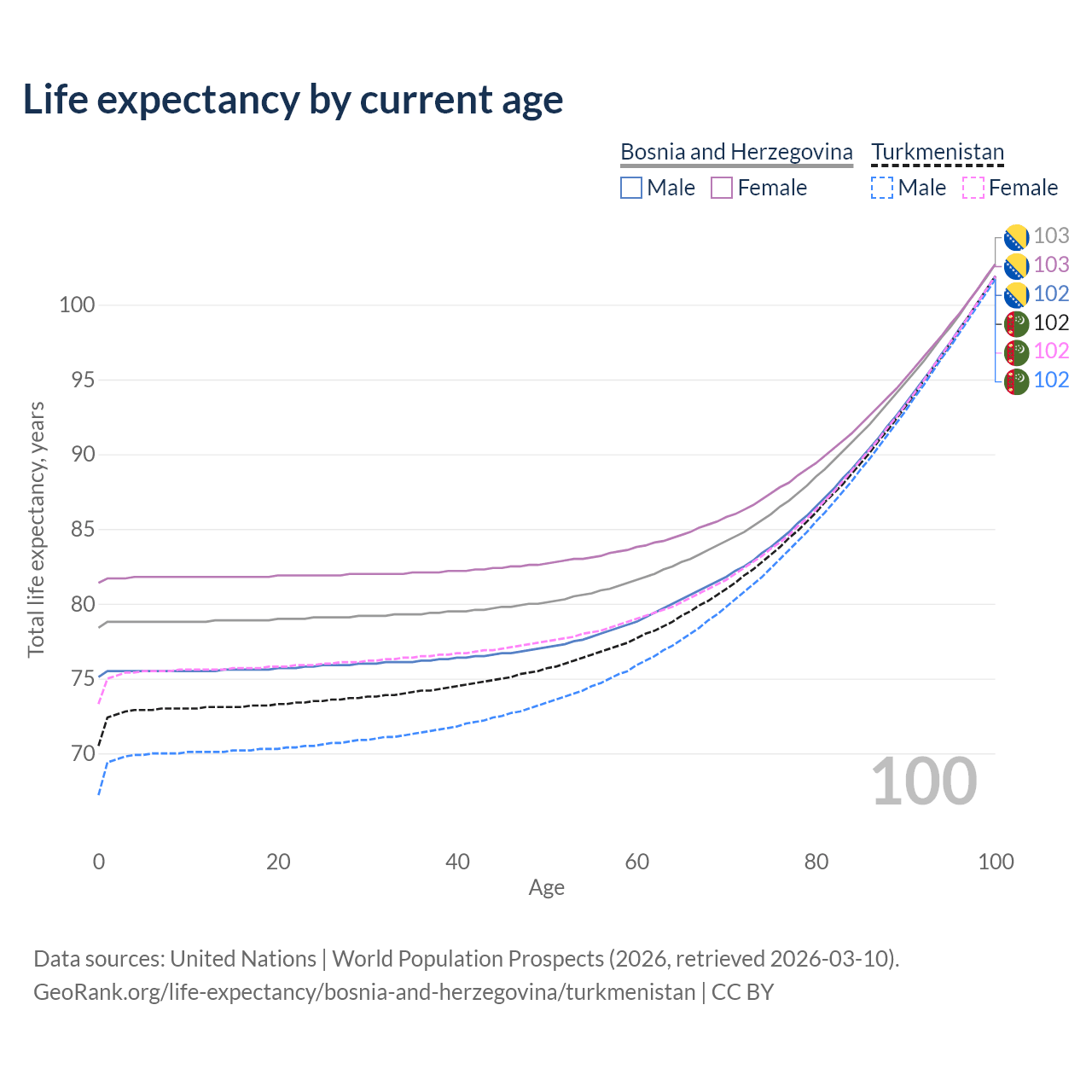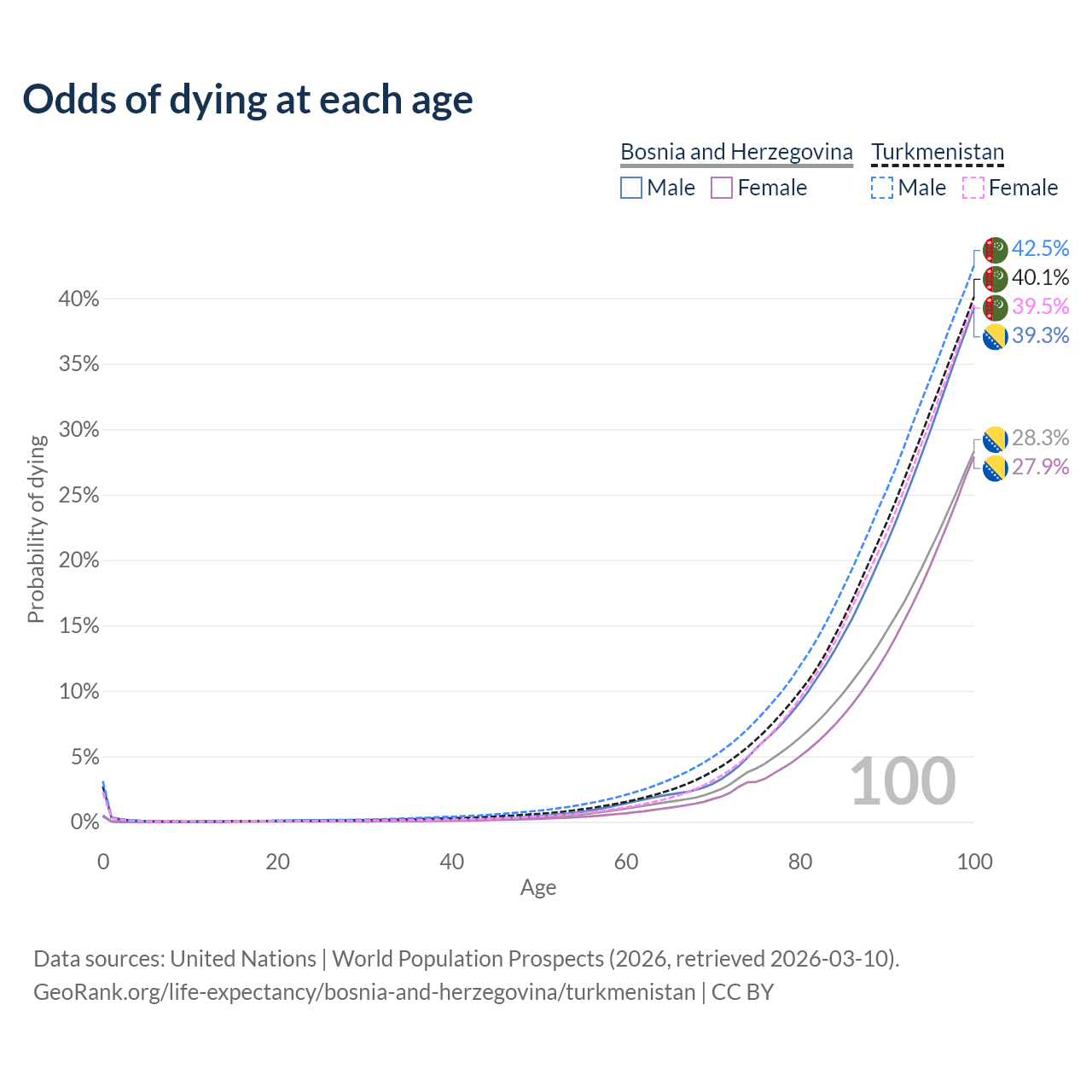 This life expectancy calculator shows the odds of living to 100, 95, 90, and below based on current age for both males and females in Bosnia and Herzegovina and Turkmenistan, along with mean and median age of death. The calculations are based on the 2026 life tables (actuarial tables) from the UN World Population Prospects.