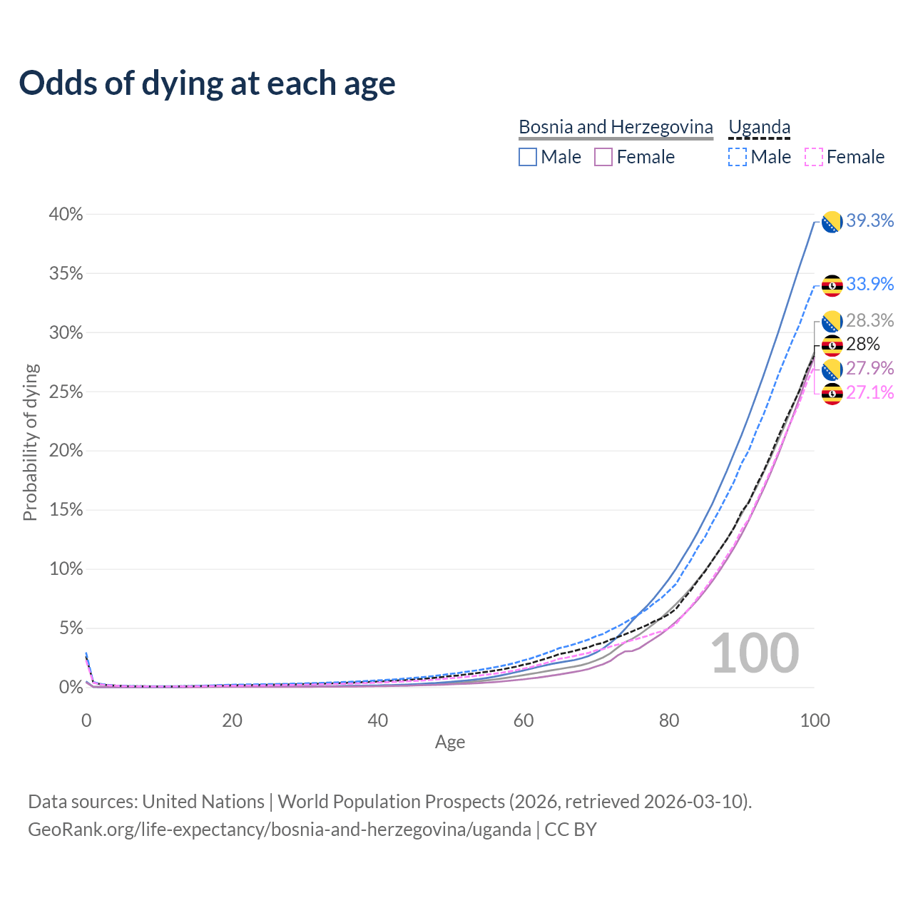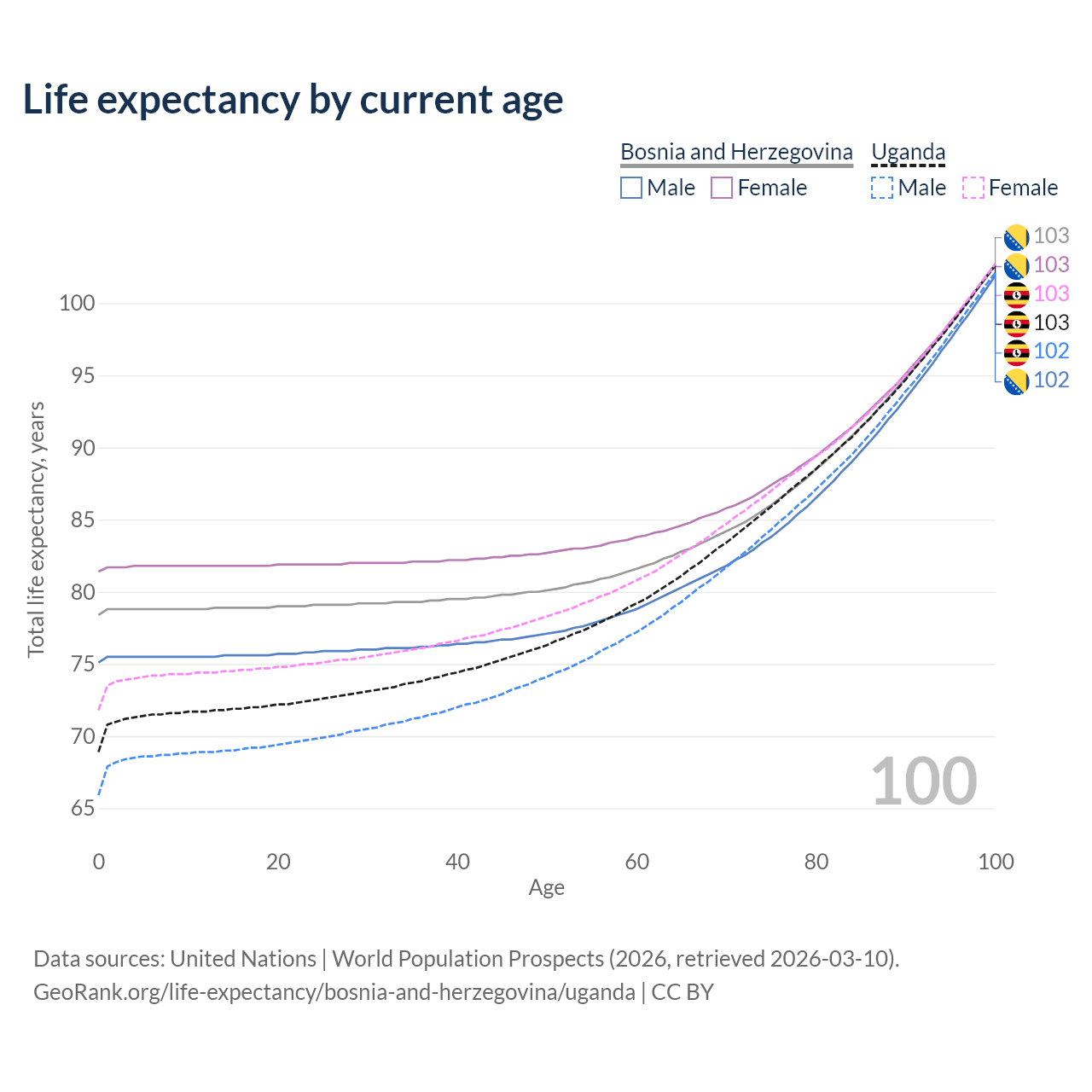 This life expectancy calculator shows the odds of living to 100, 95, 90, and below based on current age for both males and females in Bosnia and Herzegovina and Uganda, along with mean and median age of death. The calculations are based on the 2026 life tables (actuarial tables) from the UN World Population Prospects.