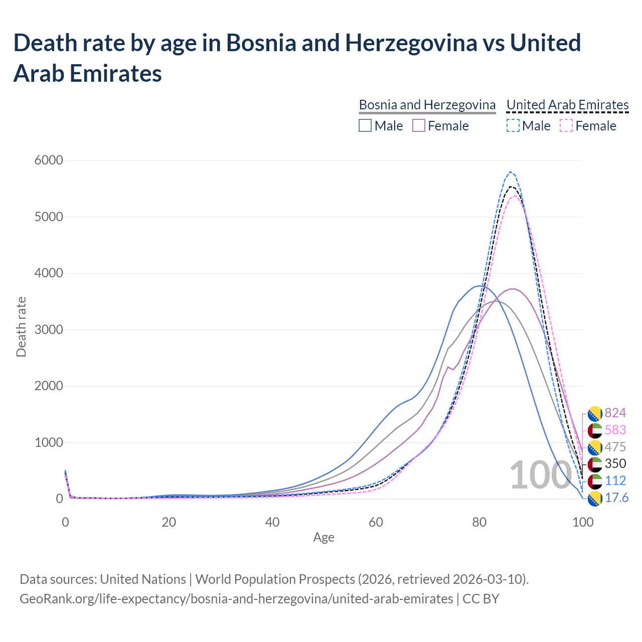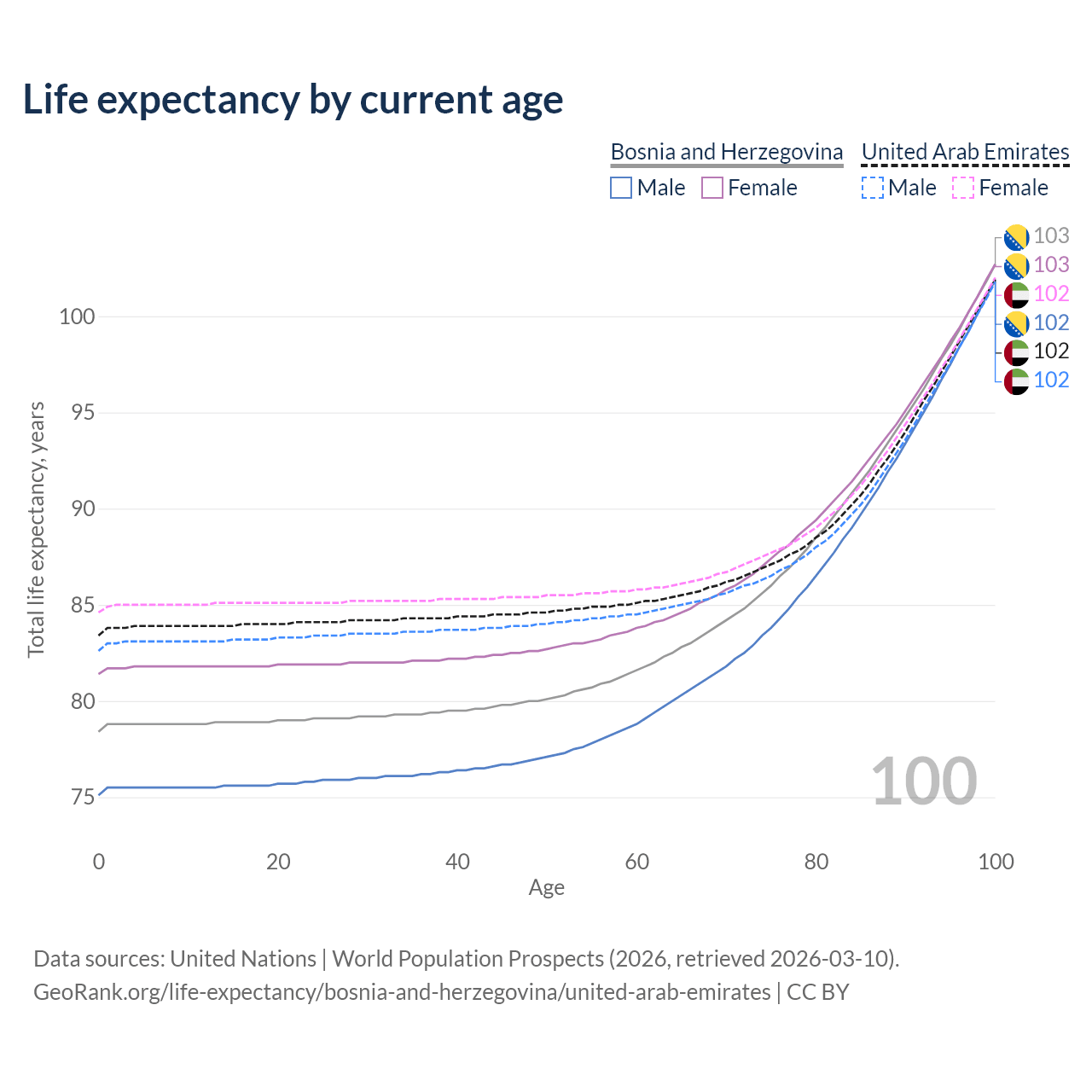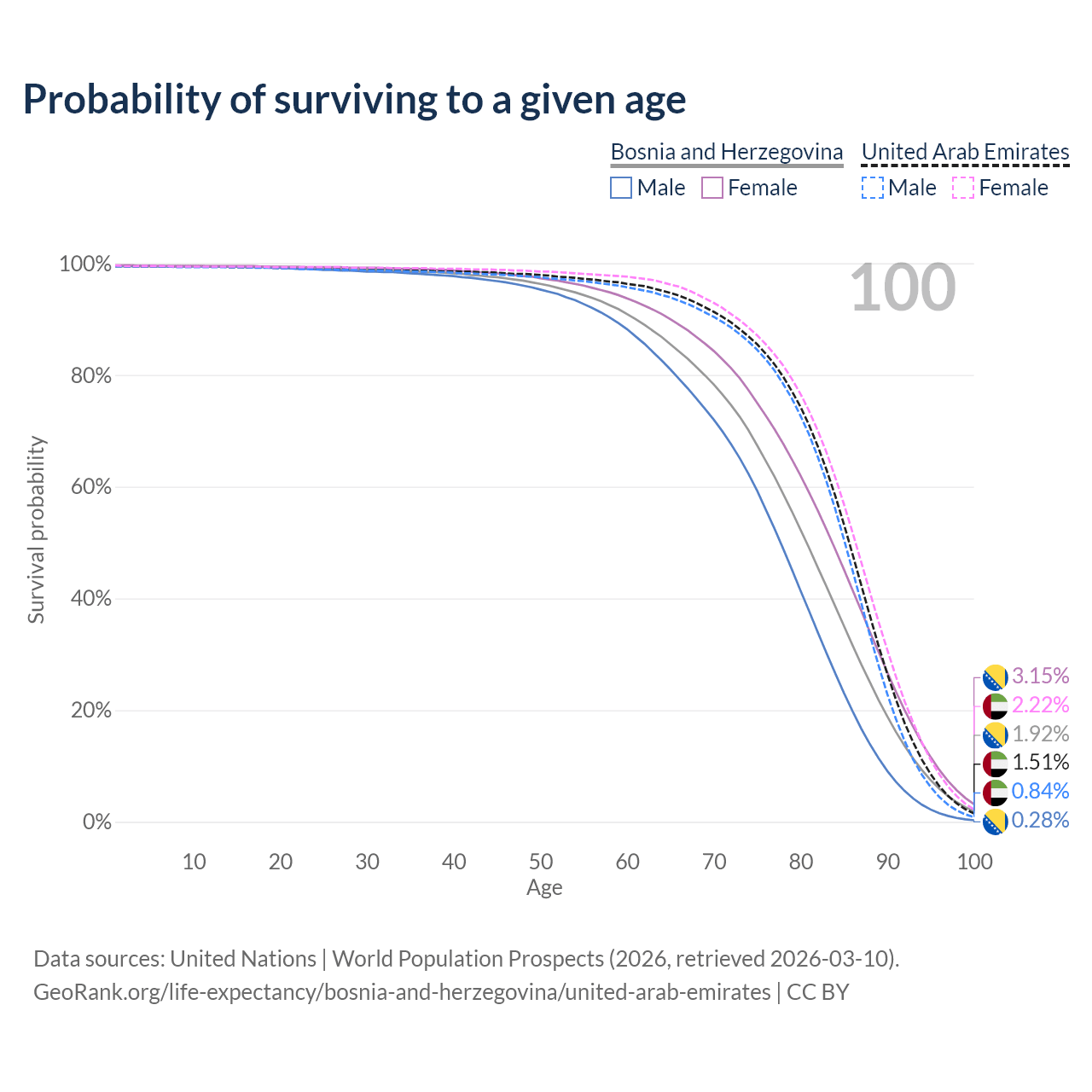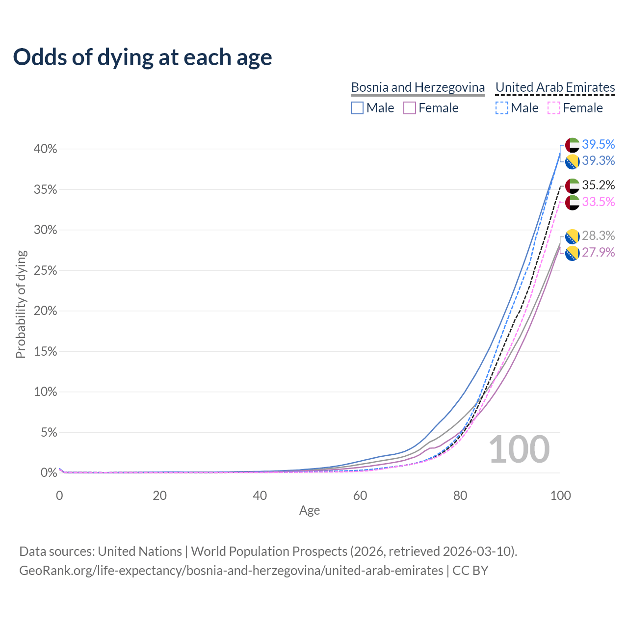 This life expectancy calculator shows the odds of living to 100, 95, 90, and below based on current age for both males and females in Bosnia and Herzegovina and the United Arab Emirates, along with mean and median age of death. The calculations are based on the 2026 life tables (actuarial tables) from the UN World Population Prospects.