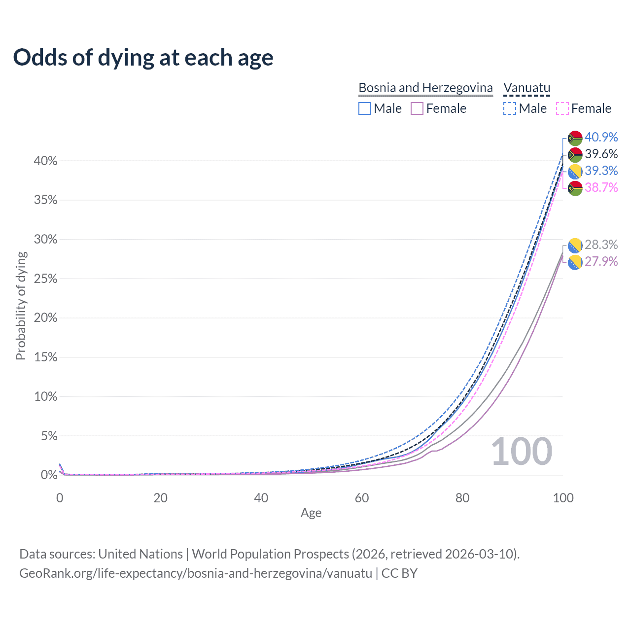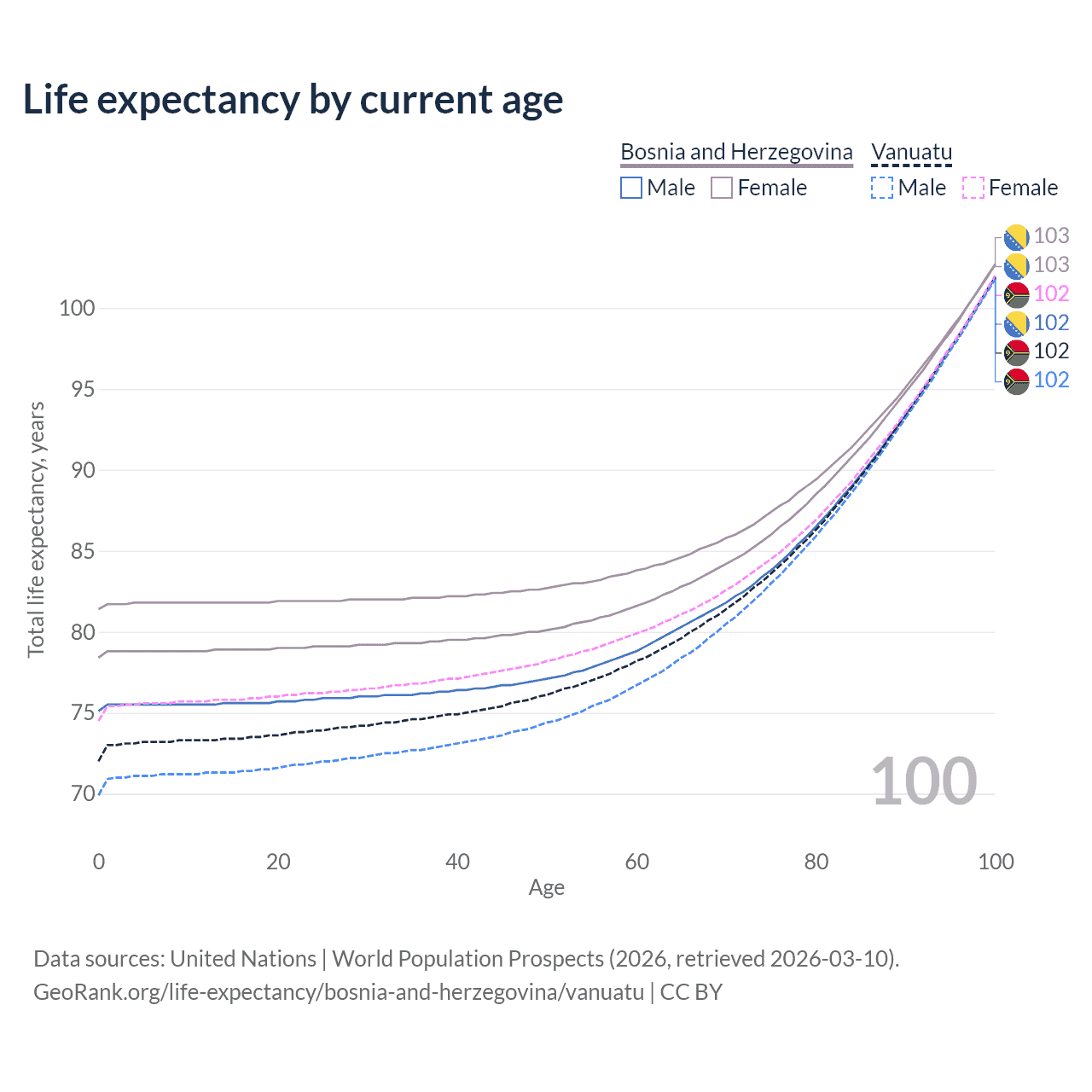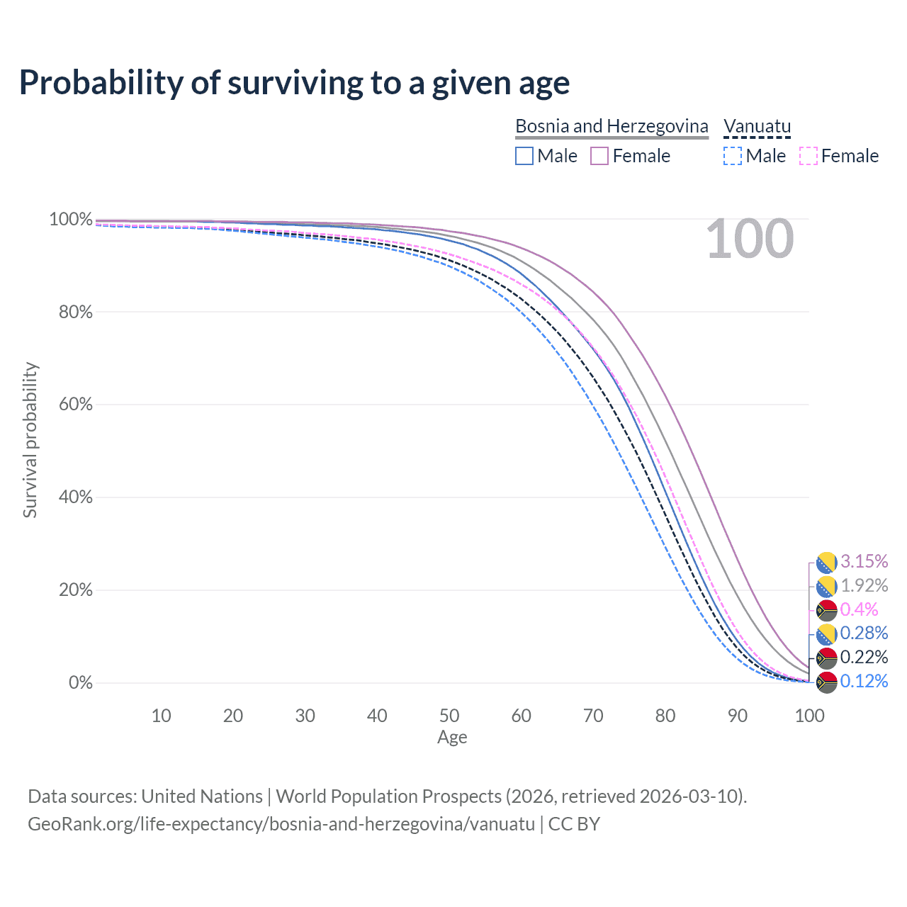This life expectancy calculator shows the odds of living to 100, 95, 90, and below based on current age for both males and females in Bosnia and Herzegovina and Vanuatu, along with mean and median age of death. The calculations are based on the 2026 life tables (actuarial tables) from the UN World Population Prospects.