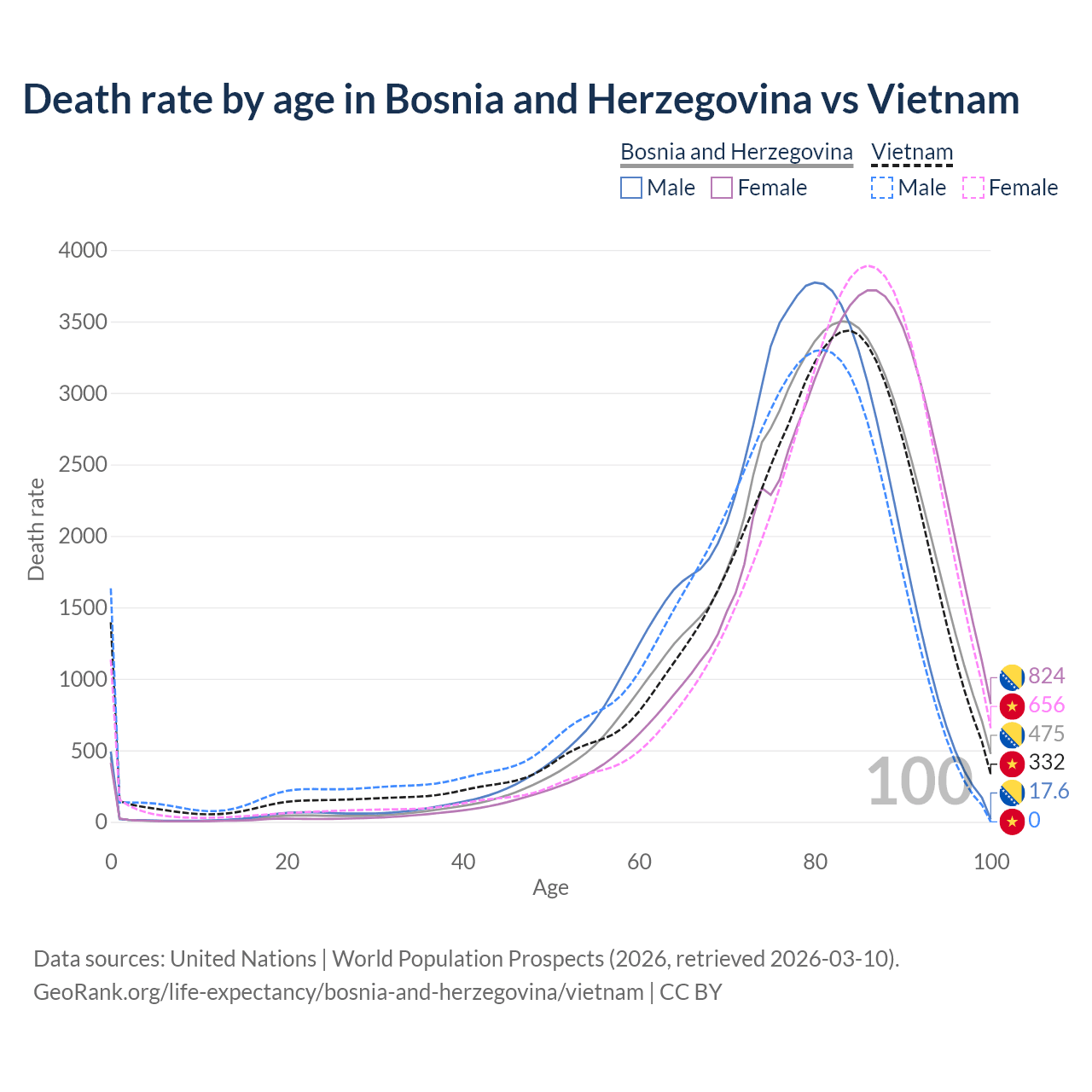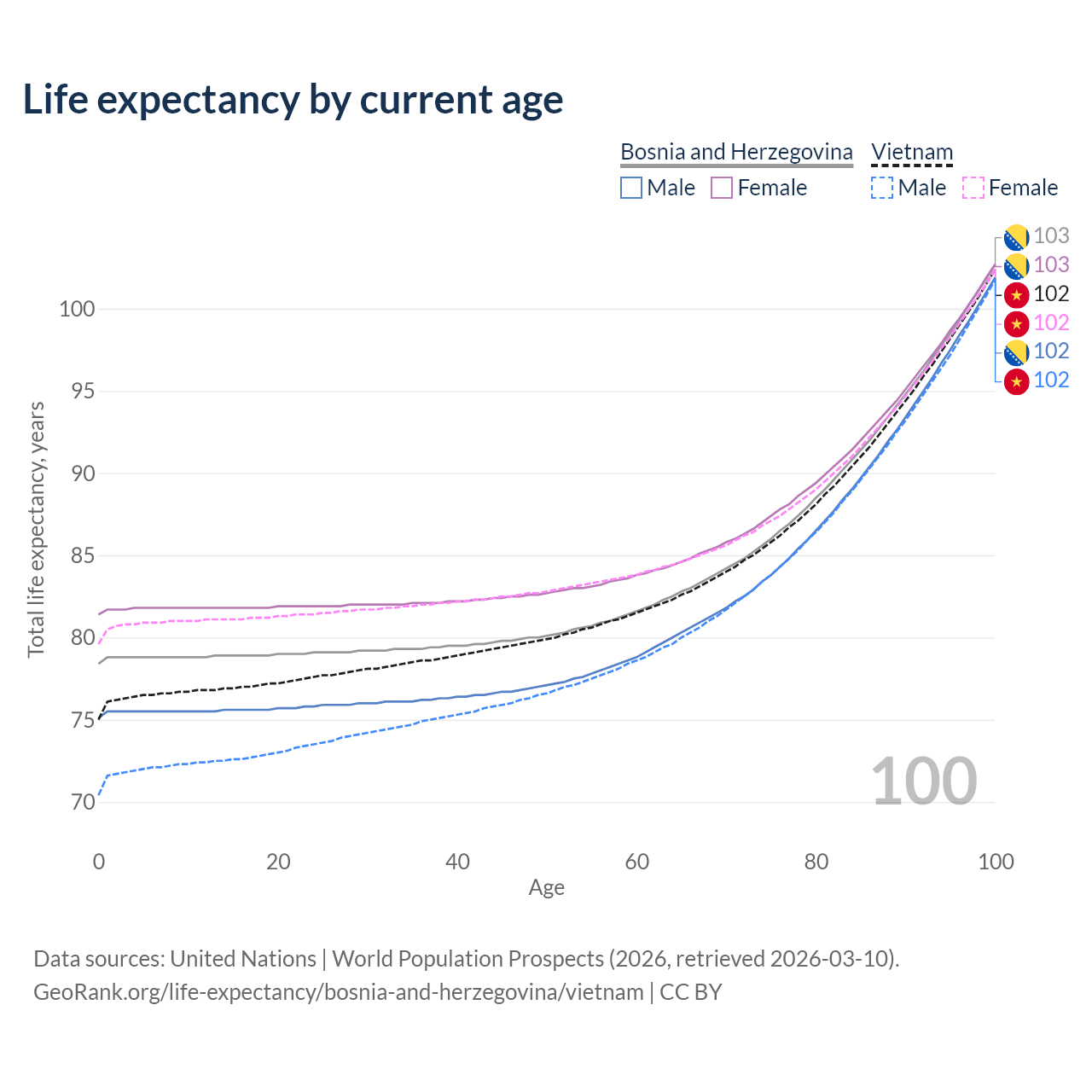 This life expectancy calculator shows the odds of living to 100, 95, 90, and below based on current age for both males and females in Bosnia and Herzegovina and Vietnam, along with mean and median age of death. The calculations are based on the 2026 life tables (actuarial tables) from the UN World Population Prospects.