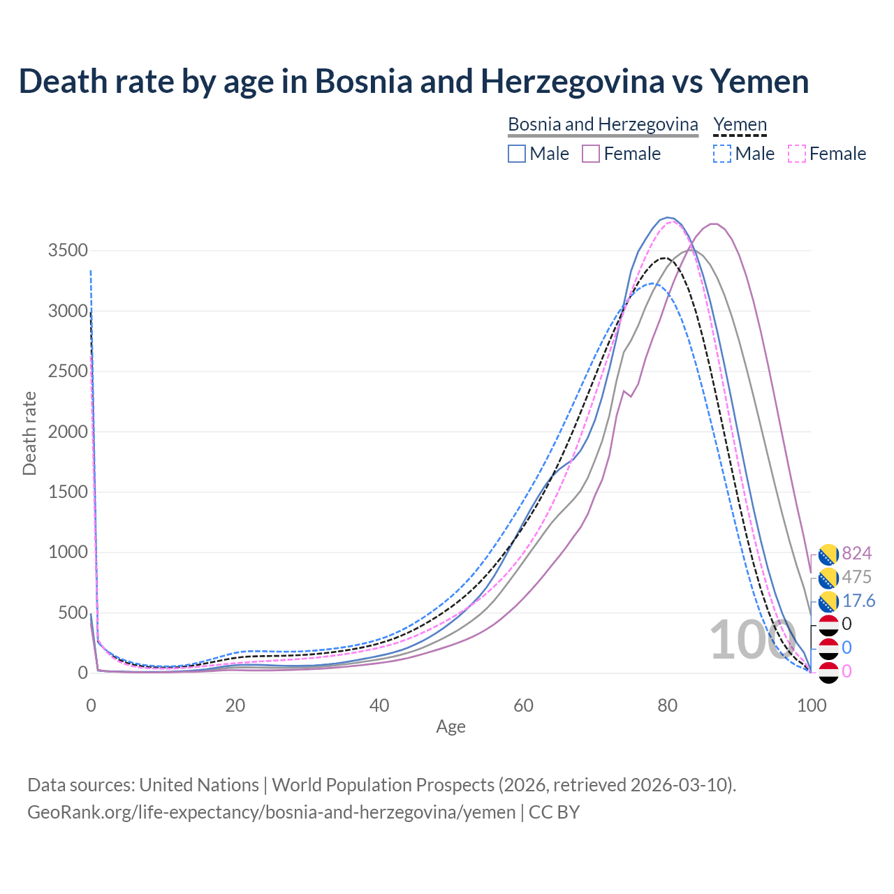 In Bosnia and Herzegovina, the most common age of death is 83, compared to 80 in Yemen. The median age of death is 80.7 in Bosnia and Herzegovina and 74.9 in Yemen, meaning only half of each cohort is expected to live past that age.