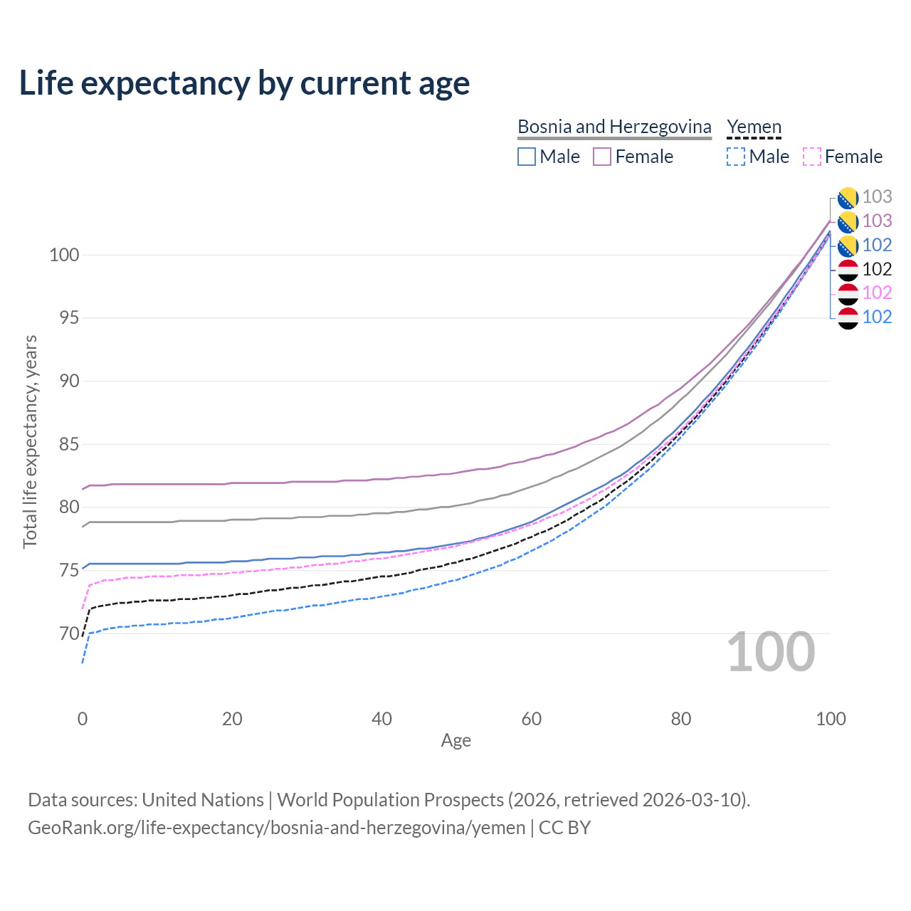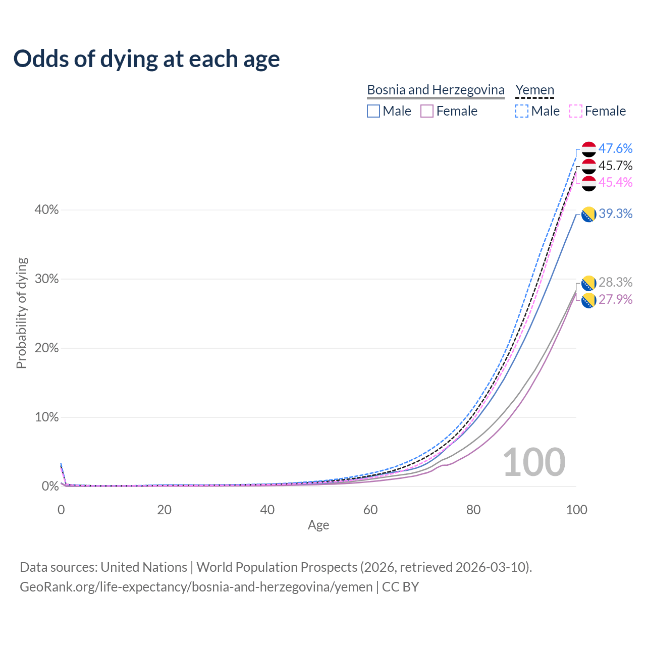 This life expectancy calculator shows the odds of living to 100, 95, 90, and below based on current age for both males and females in Bosnia and Herzegovina and Yemen, along with mean and median age of death. The calculations are based on the 2026 life tables (actuarial tables) from the UN World Population Prospects.