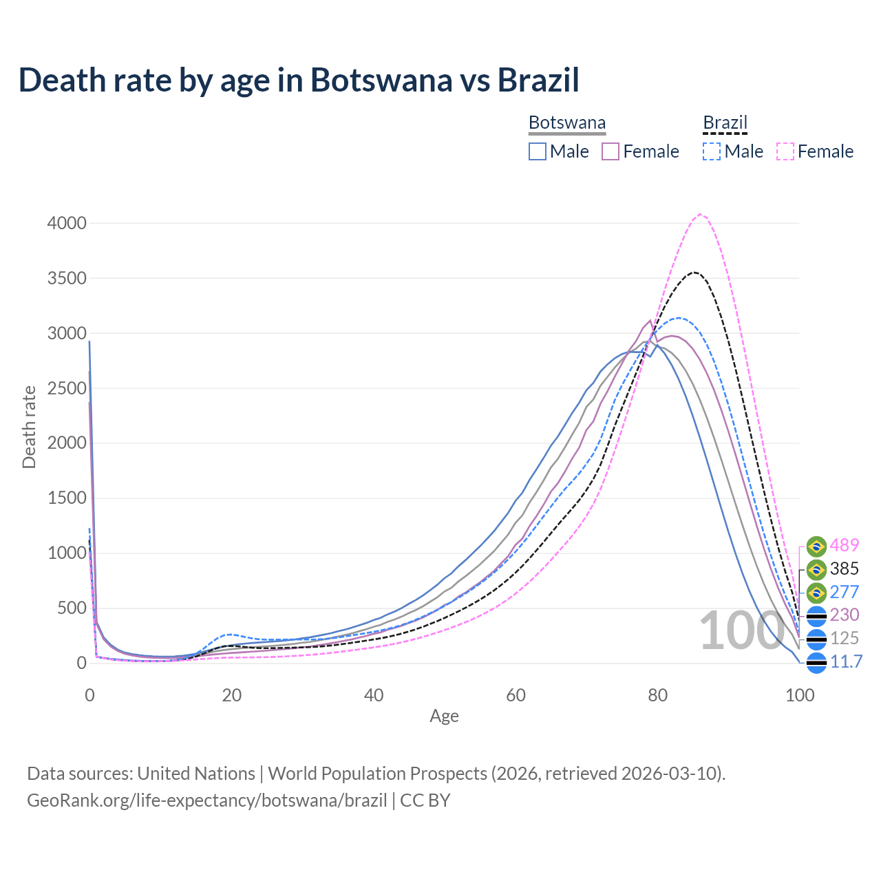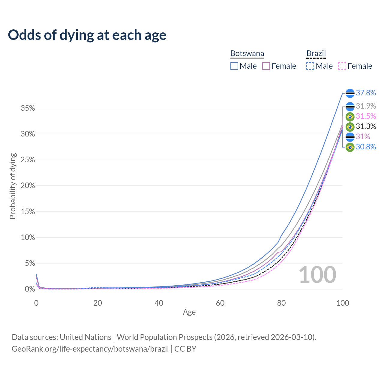This life expectancy calculator shows the odds of living to 100, 95, 90, and below based on current age for both males and females in Botswana and Brazil, along with mean and median age of death. The calculations are based on the 2026 life tables (actuarial tables) from the UN World Population Prospects.