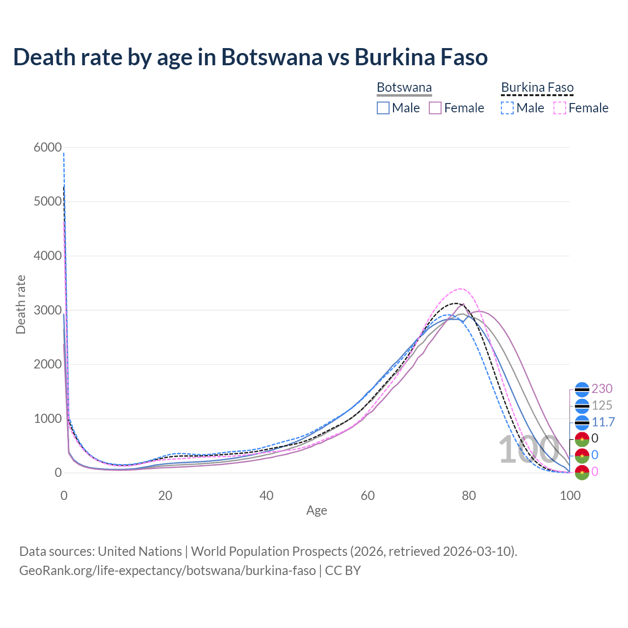 In Botswana, the most common age of death is 79, compared to 0 in Burkina Faso. The median age of death is 74.4 in Botswana and 70.4 in Burkina Faso, meaning only half of each cohort is expected to live past that age.