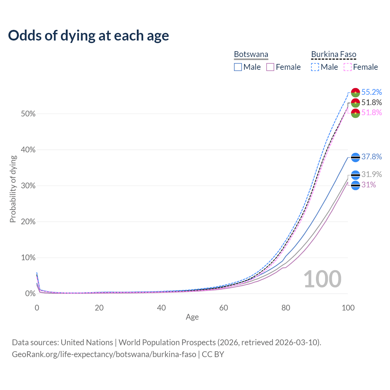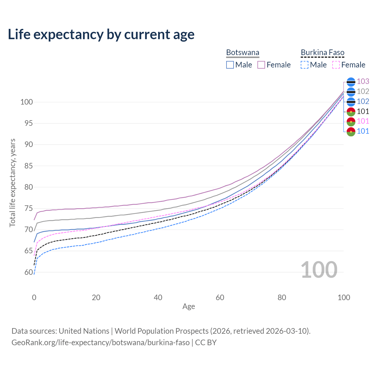 This life expectancy calculator shows the odds of living to 100, 95, 90, and below based on current age for both males and females in Botswana and Burkina Faso, along with mean and median age of death. The calculations are based on the 2026 life tables (actuarial tables) from the UN World Population Prospects.