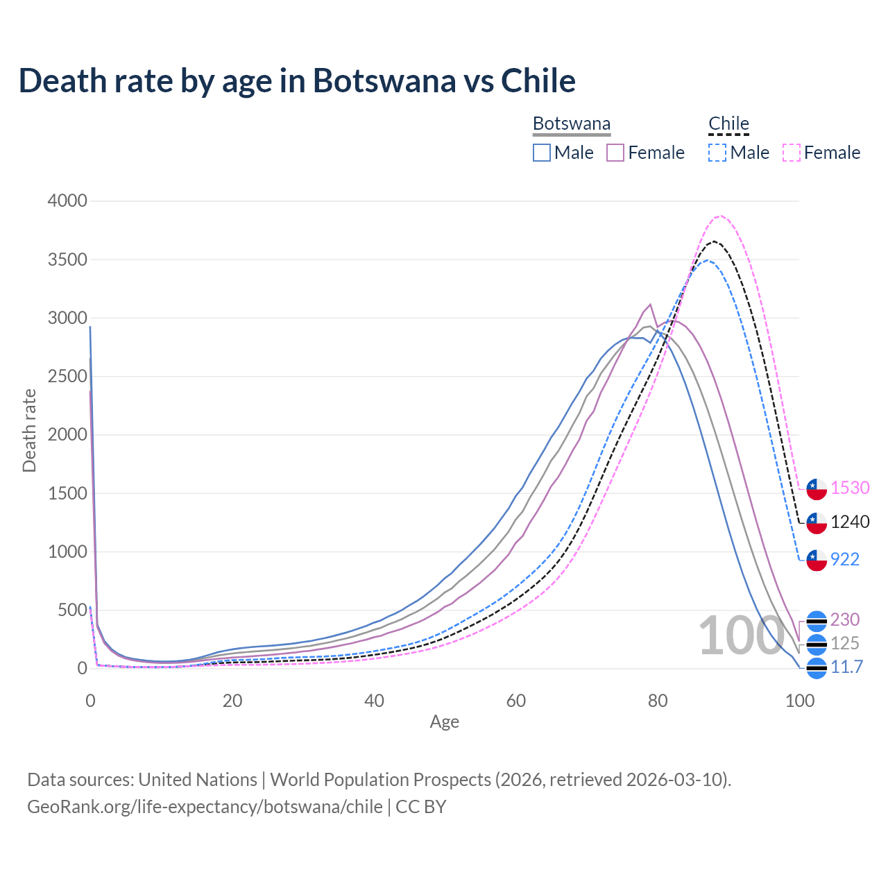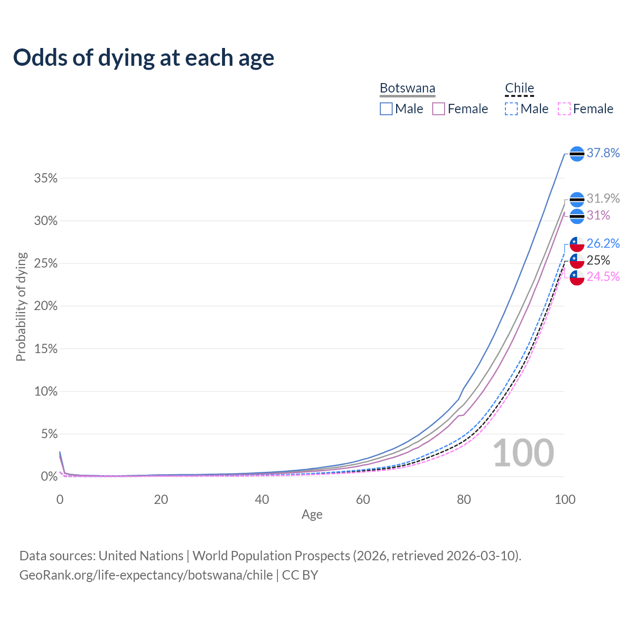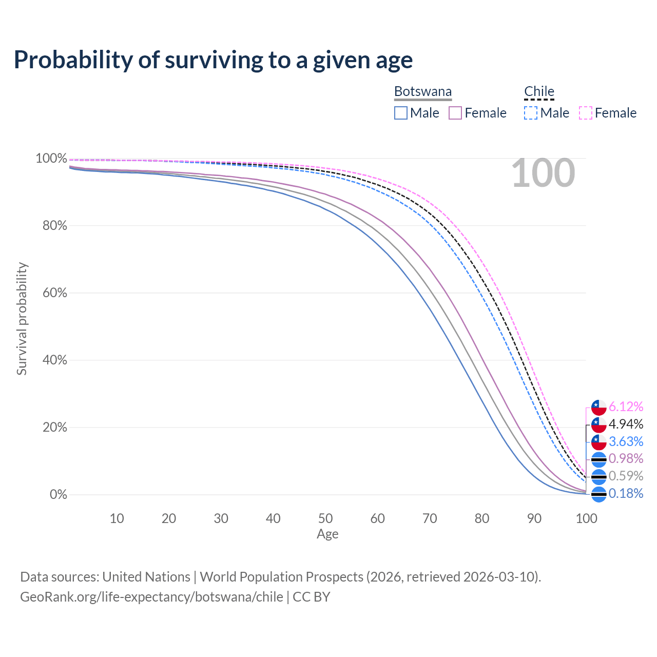 This life expectancy calculator shows the odds of living to 100, 95, 90, and below based on current age for both males and females in Botswana and Chile, along with mean and median age of death. The calculations are based on the 2026 life tables (actuarial tables) from the UN World Population Prospects.