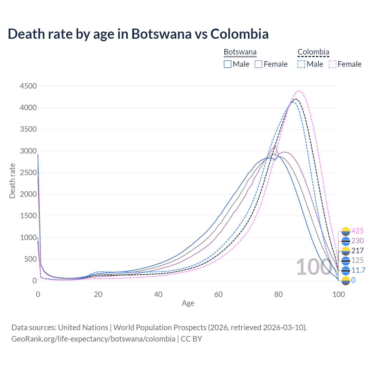 In Botswana, the most common age of death is 79, compared to 86 in Colombia. The median age of death is 74.4 in Botswana and 82.5 in Colombia, meaning only half of each cohort is expected to live past that age.