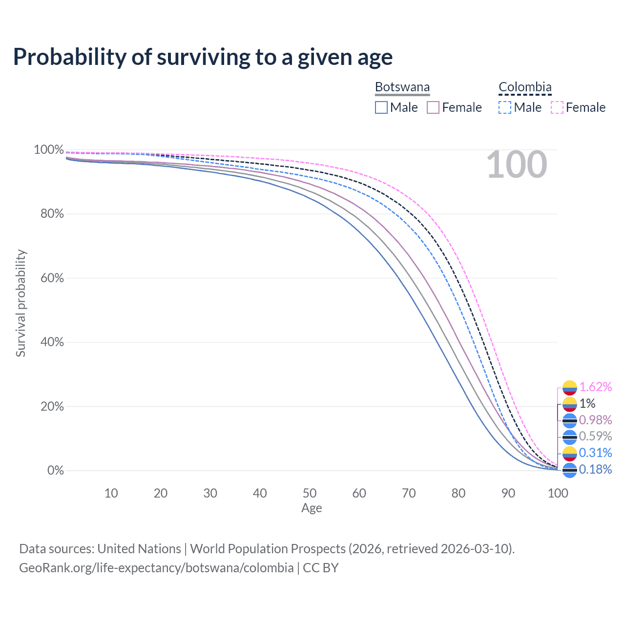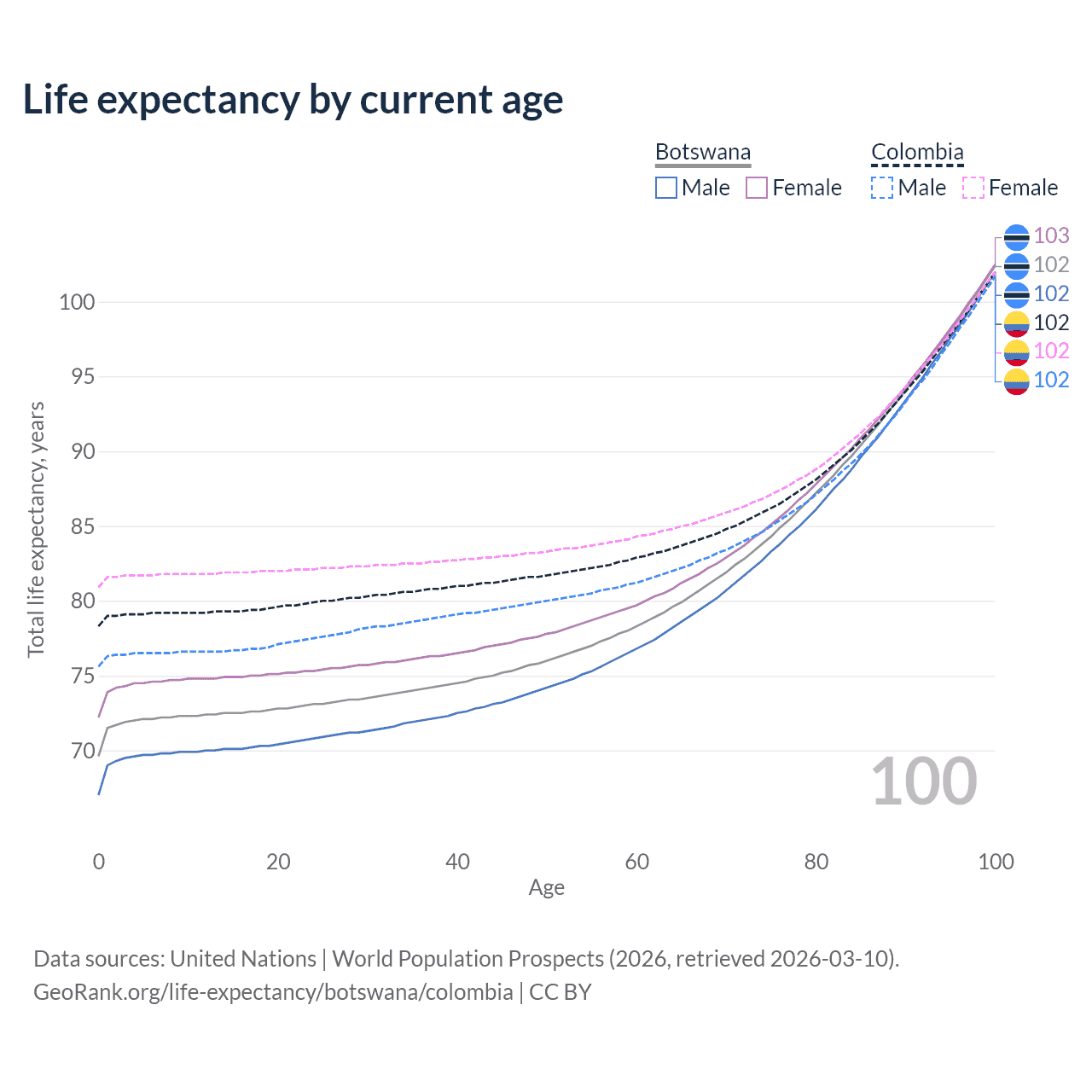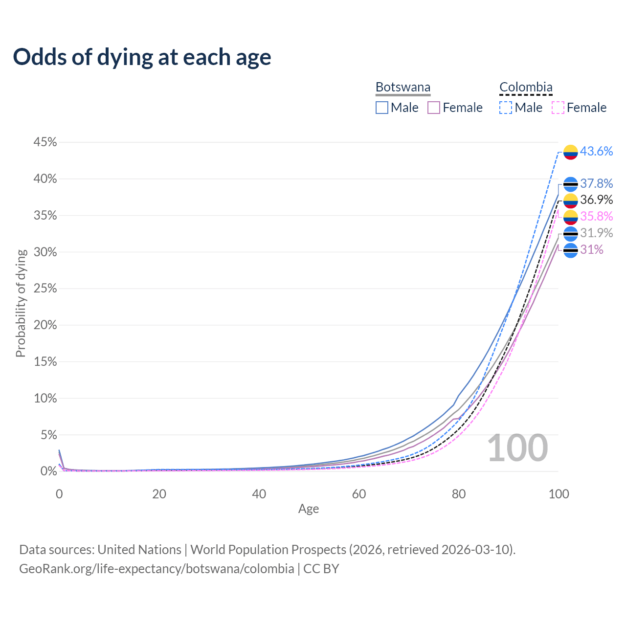 This life expectancy calculator shows the odds of living to 100, 95, 90, and below based on current age for both males and females in Botswana and Colombia, along with mean and median age of death. The calculations are based on the 2026 life tables (actuarial tables) from the UN World Population Prospects.