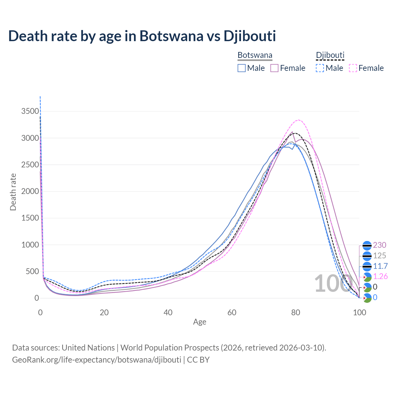 In Botswana, the most common age of death is 79, compared to 0 in Djibouti. The median age of death is 74.4 in Botswana and 73.7 in Djibouti, meaning only half of each cohort is expected to live past that age.
