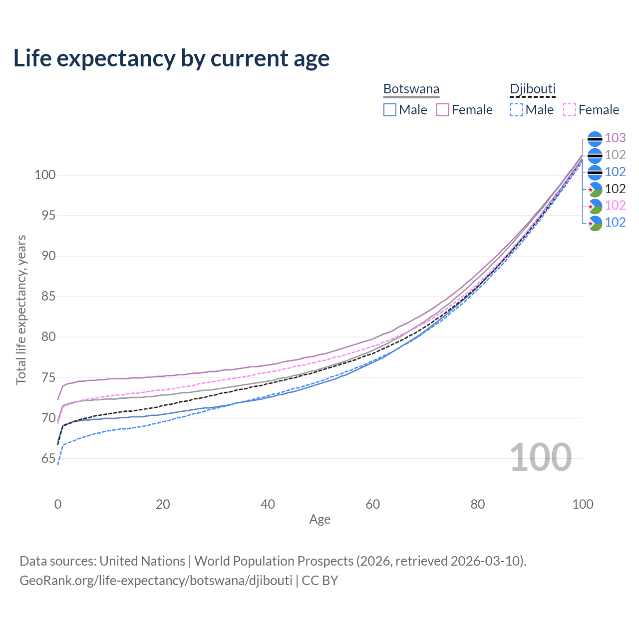 This life expectancy calculator shows the odds of living to 100, 95, 90, and below based on current age for both males and females in Botswana and Djibouti, along with mean and median age of death. The calculations are based on the 2026 life tables (actuarial tables) from the UN World Population Prospects.