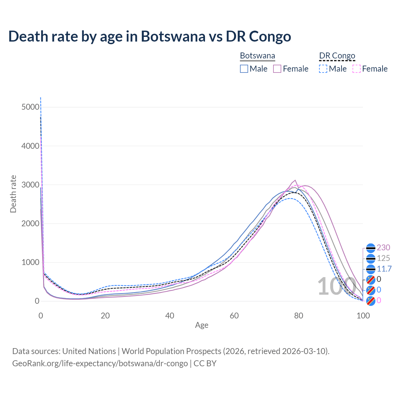 In Botswana, the most common age of death is 79, compared to 0 in the DR Congo. The median age of death is 74.4 in Botswana and 70.9 in the DR Congo, meaning only half of each cohort is expected to live past that age.