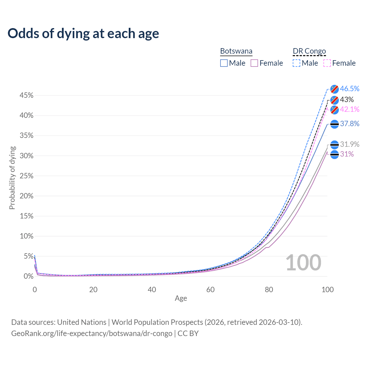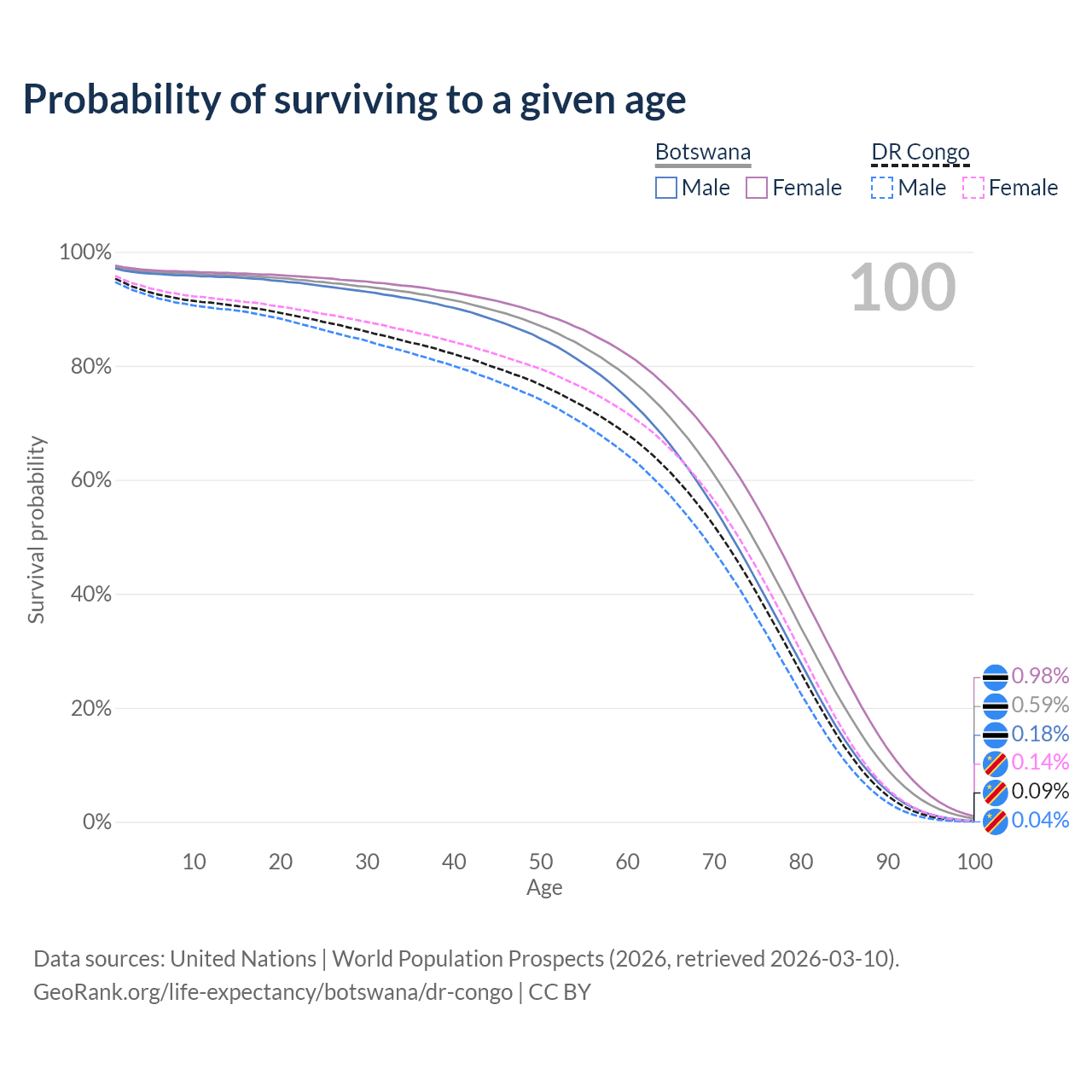 This life expectancy calculator shows the odds of living to 100, 95, 90, and below based on current age for both males and females in Botswana and the DR Congo, along with mean and median age of death. The calculations are based on the 2026 life tables (actuarial tables) from the UN World Population Prospects.