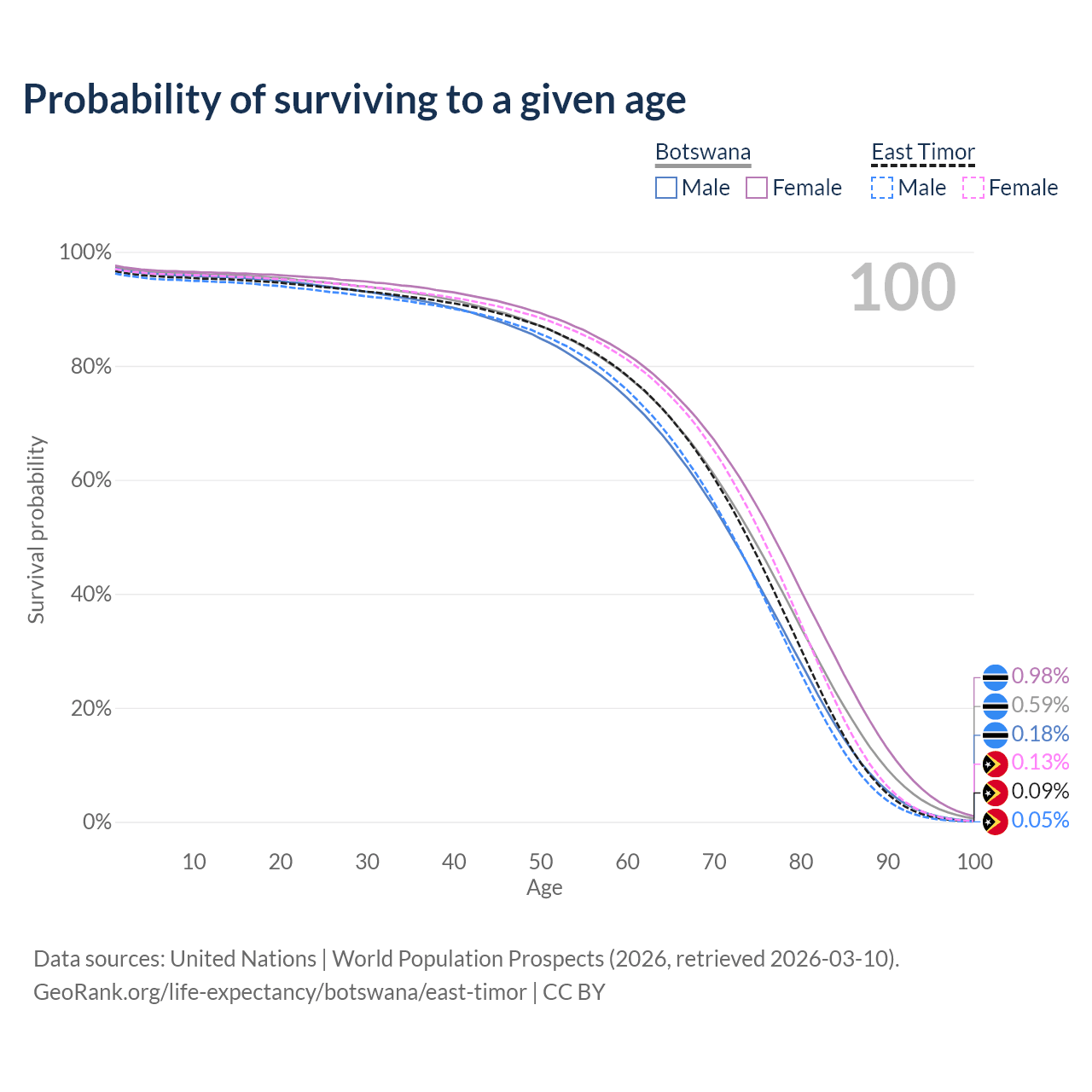 This life expectancy calculator shows the odds of living to 100, 95, 90, and below based on current age for both males and females in Botswana and East Timor, along with mean and median age of death. The calculations are based on the 2026 life tables (actuarial tables) from the UN World Population Prospects.