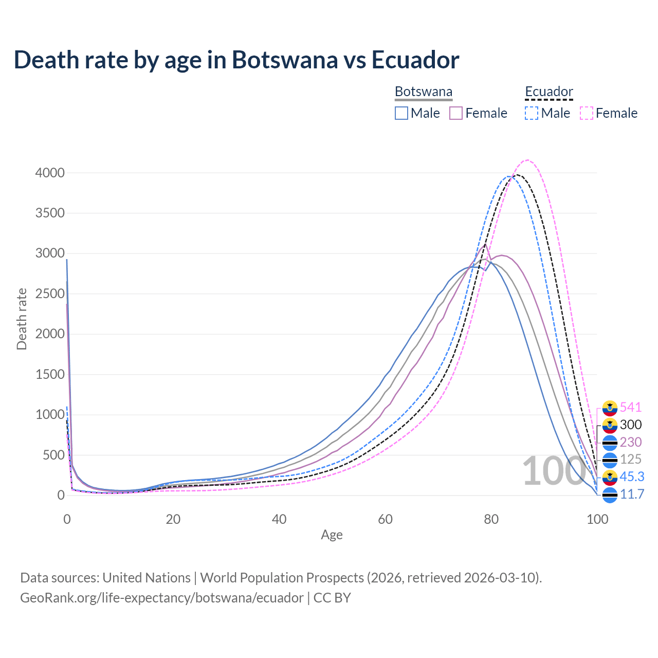 In Botswana, the most common age of death is 79, compared to 85 in Ecuador. The median age of death is 74.4 in Botswana and 82.3 in Ecuador, meaning only half of each cohort is expected to live past that age.