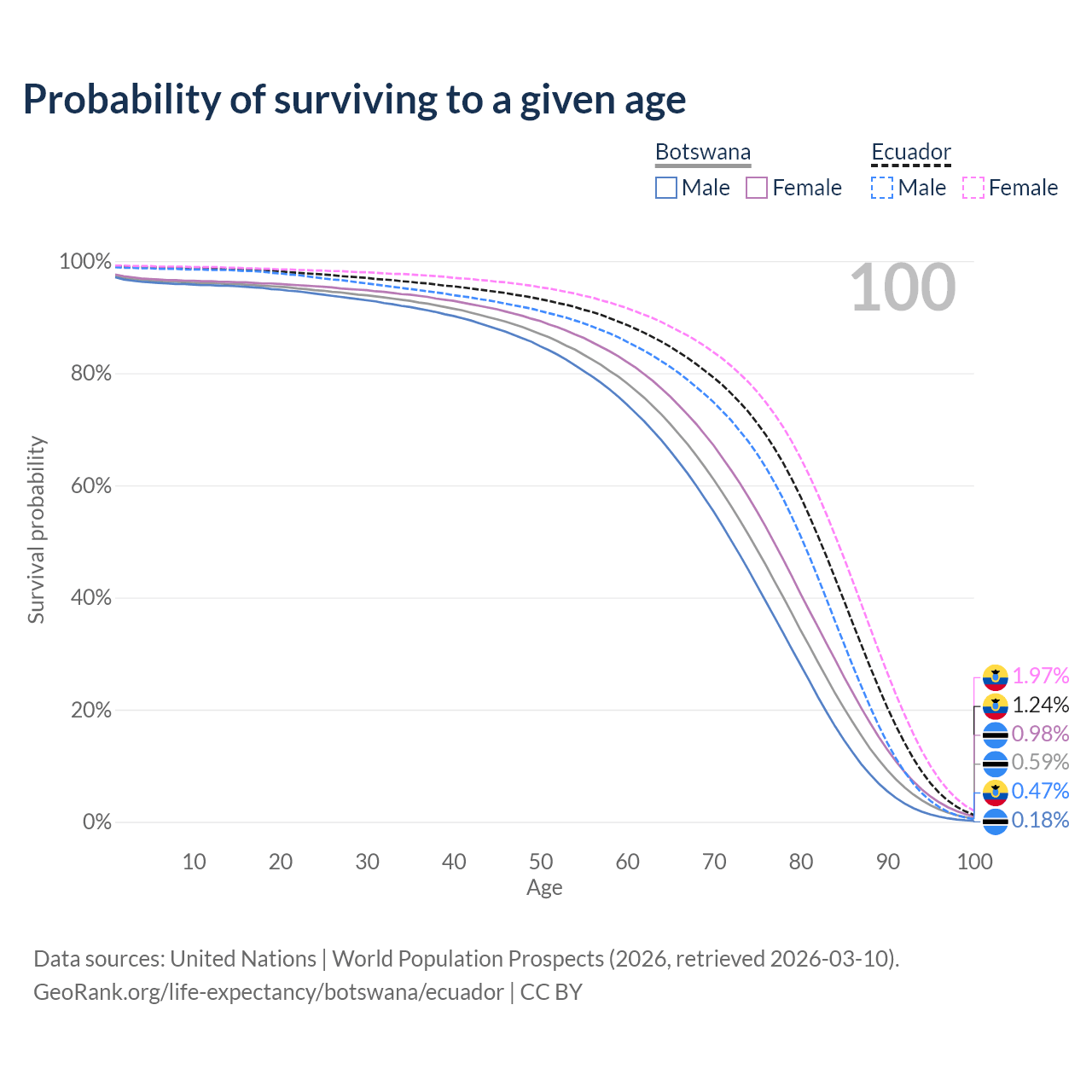 This life expectancy calculator shows the odds of living to 100, 95, 90, and below based on current age for both males and females in Botswana and Ecuador, along with mean and median age of death. The calculations are based on the 2026 life tables (actuarial tables) from the UN World Population Prospects.
