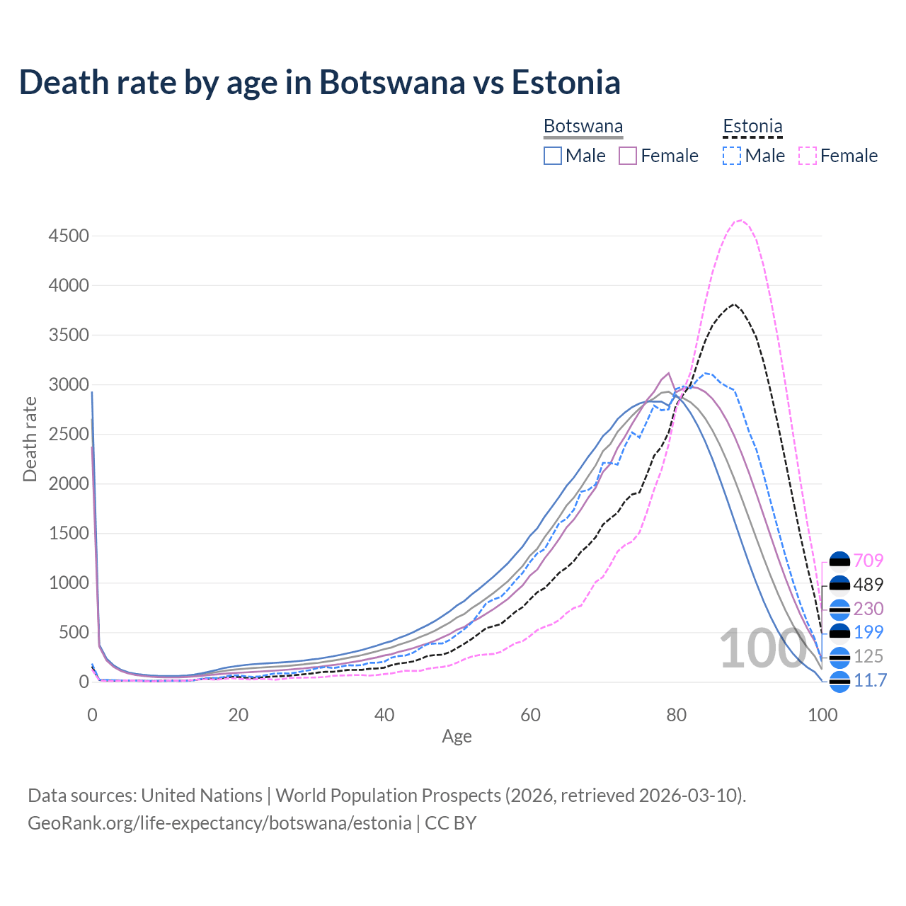 In Botswana, the most common age of death is 79, compared to 88 in Estonia. The median age of death is 74.4 in Botswana and 83.1 in Estonia, meaning only half of each cohort is expected to live past that age.