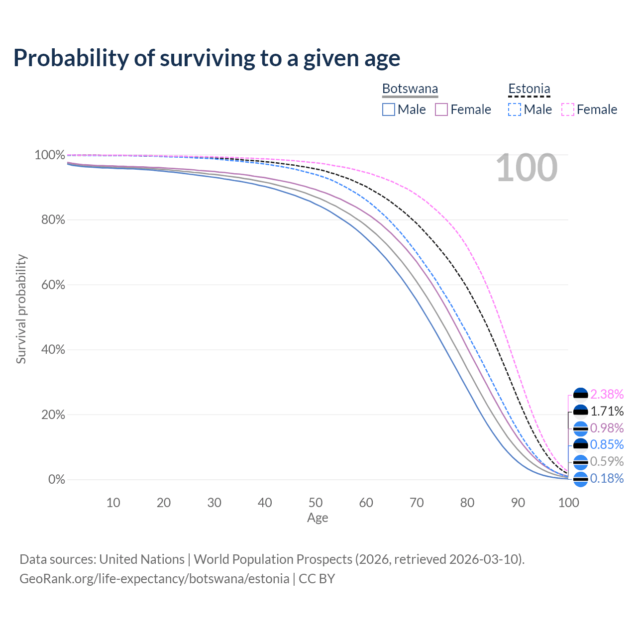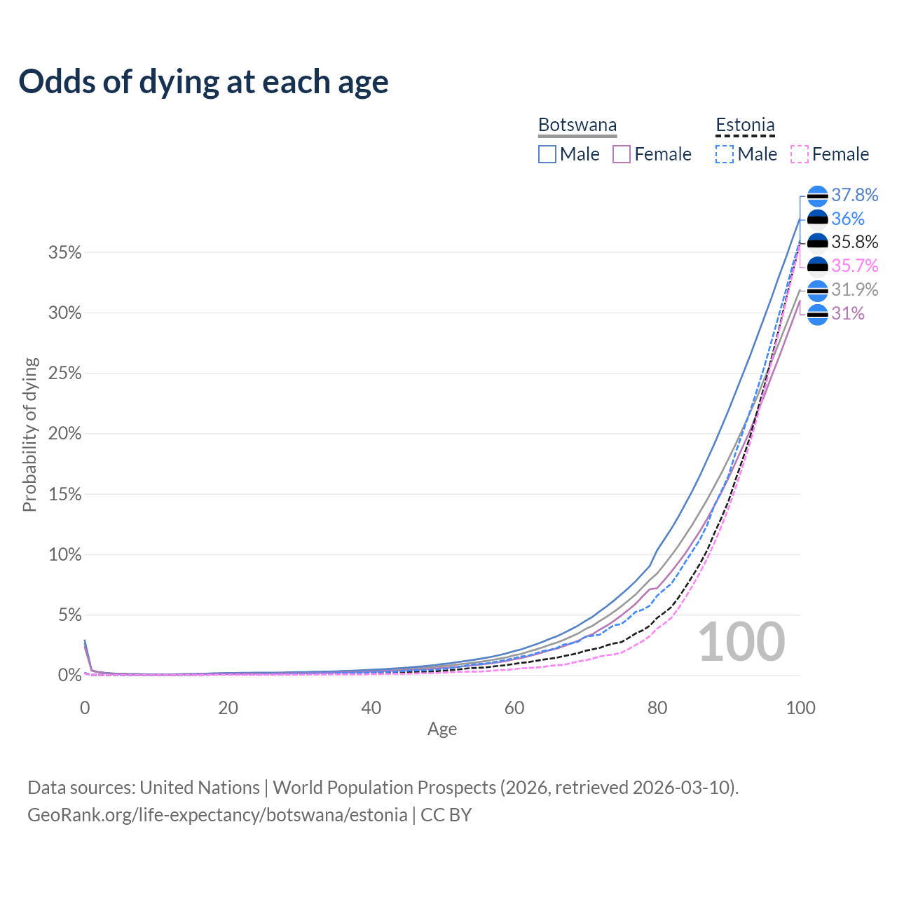 This life expectancy calculator shows the odds of living to 100, 95, 90, and below based on current age for both males and females in Botswana and Estonia, along with mean and median age of death. The calculations are based on the 2026 life tables (actuarial tables) from the UN World Population Prospects.