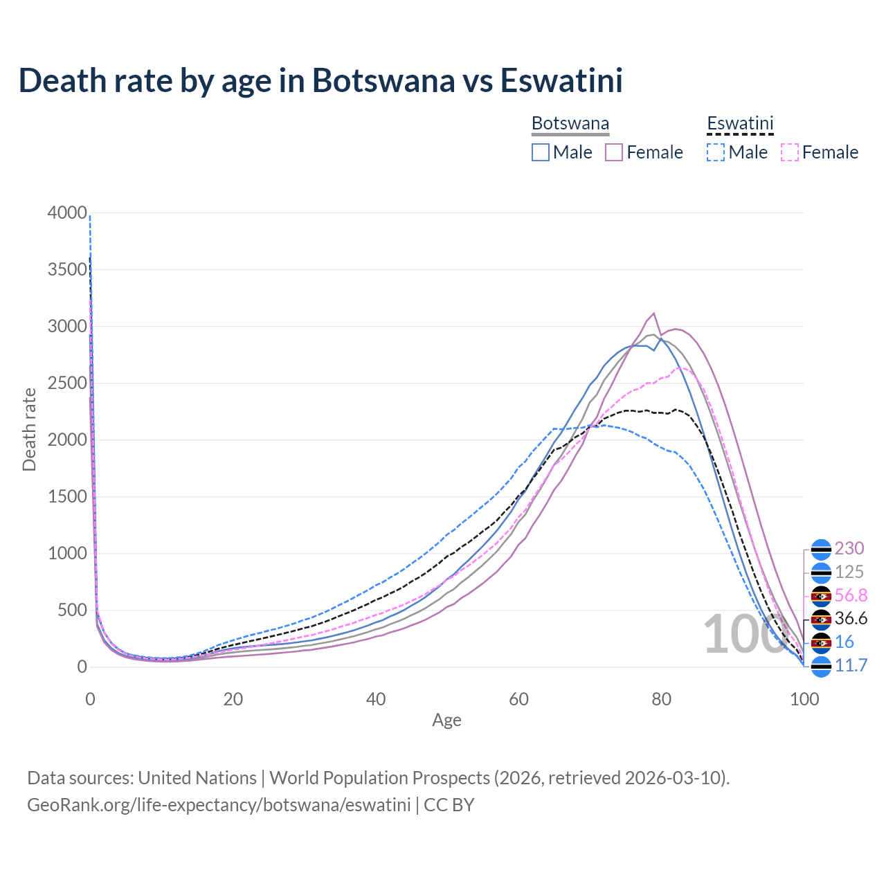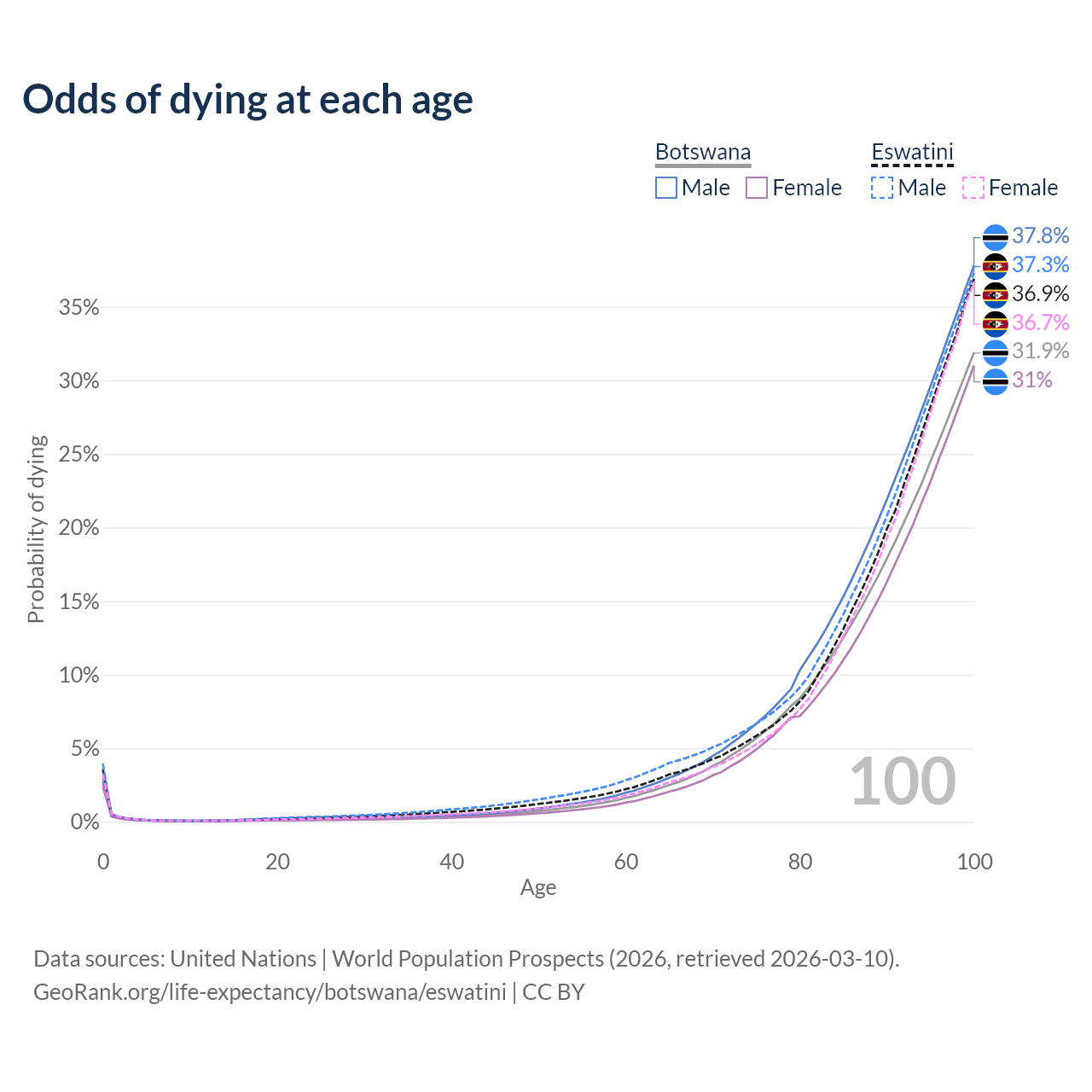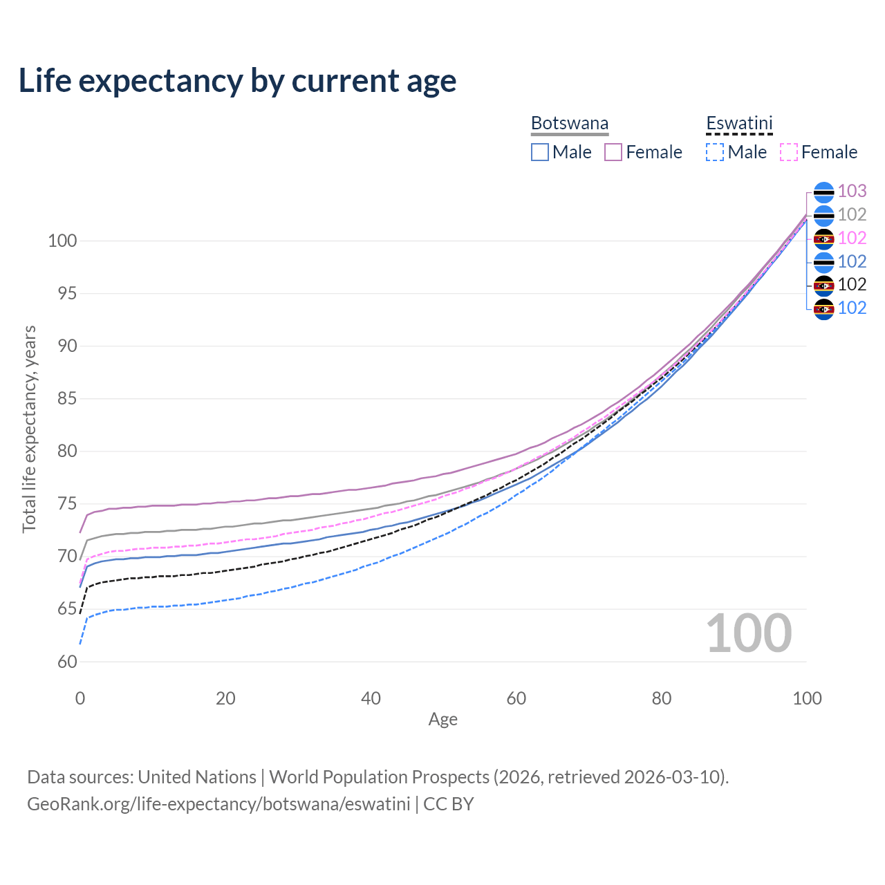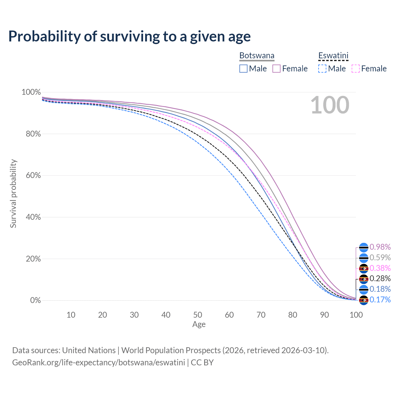 This life expectancy calculator shows the odds of living to 100, 95, 90, and below based on current age for both males and females in Botswana and Eswatini, along with mean and median age of death. The calculations are based on the 2026 life tables (actuarial tables) from the UN World Population Prospects.
