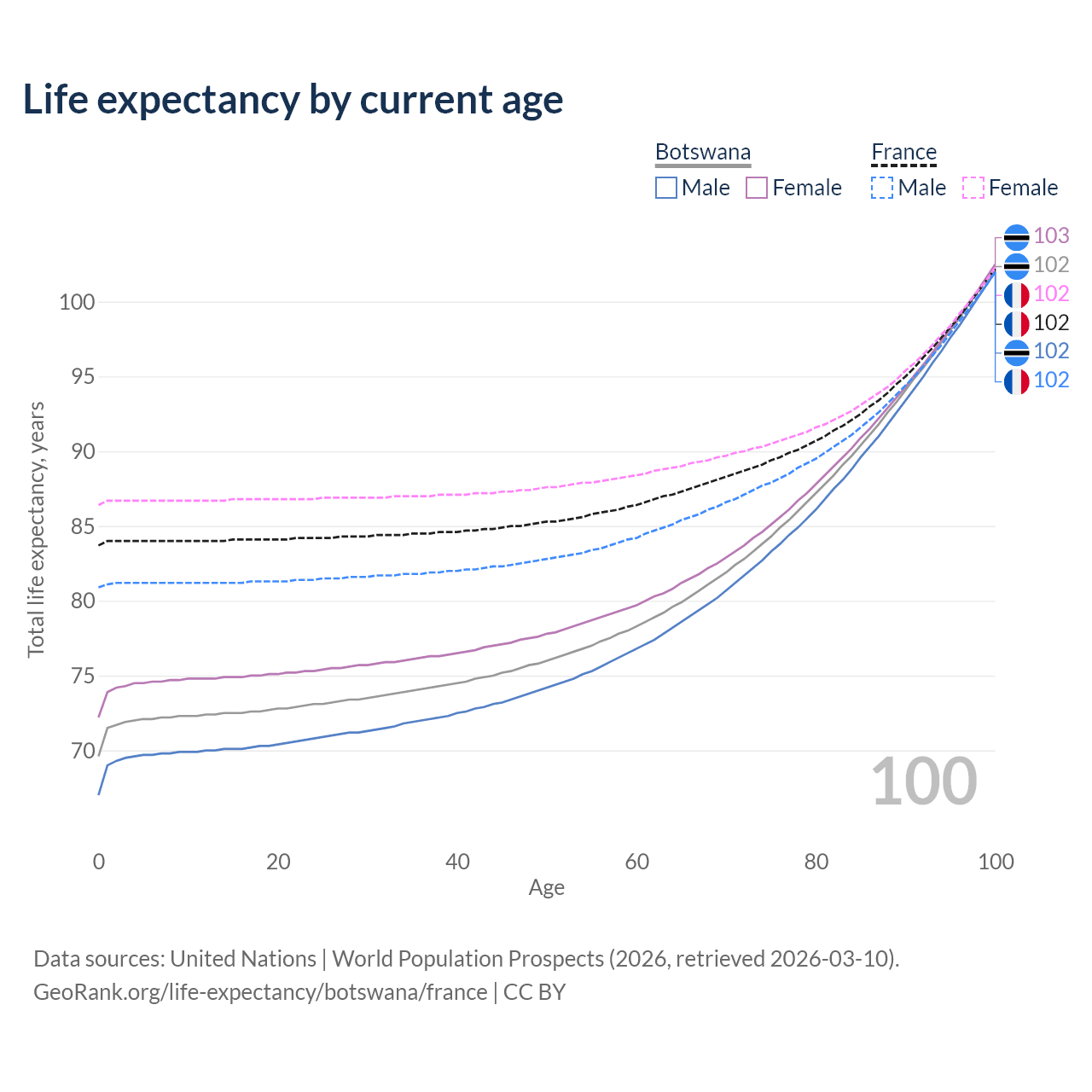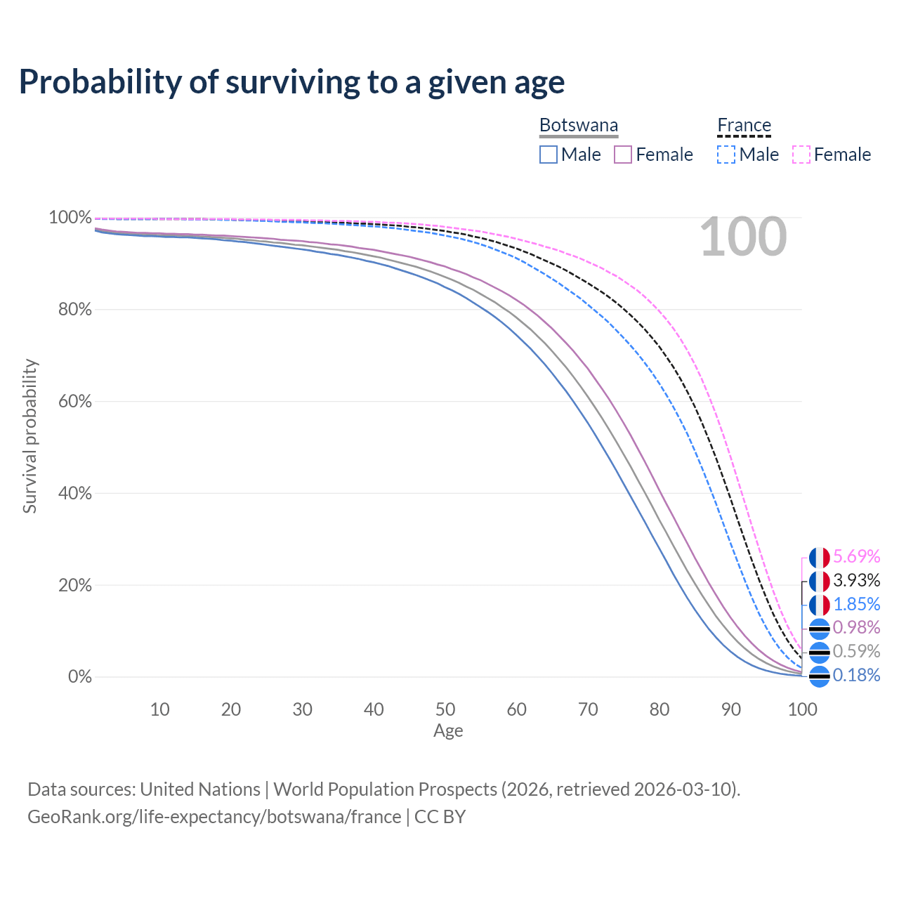 This life expectancy calculator shows the odds of living to 100, 95, 90, and below based on current age for both males and females in Botswana and France, along with mean and median age of death. The calculations are based on the 2026 life tables (actuarial tables) from the UN World Population Prospects.