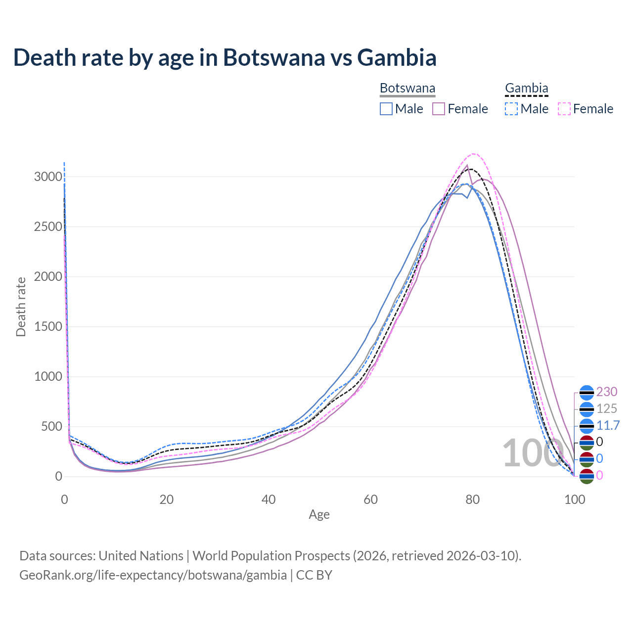 In Botswana, the most common age of death is 79, compared to 80 in the Gambia. The median age of death is 74.4 in Botswana and 73.4 in the Gambia, meaning only half of each cohort is expected to live past that age.