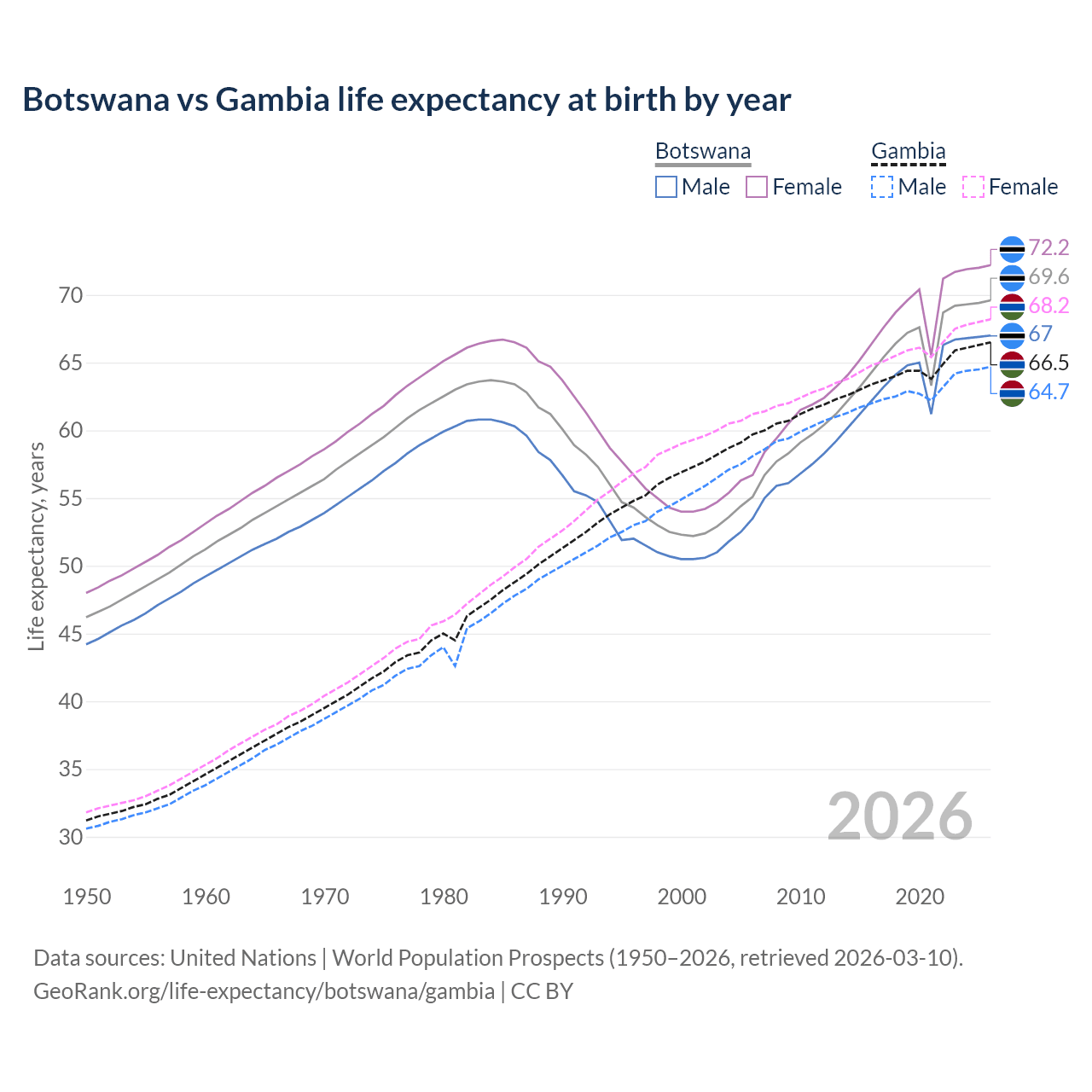 The average life expectancy at birth is 69.6 years in Botswana vs 66.5 in the Gambia. Botswana is ranked 141/197 by life expectancy, and the Gambia is 167/197. In Botswana, the life expectancy is 67 years for males and 72.2 years for females. In the Gambia, it's 64.7 years for males and 68.2 years for females.