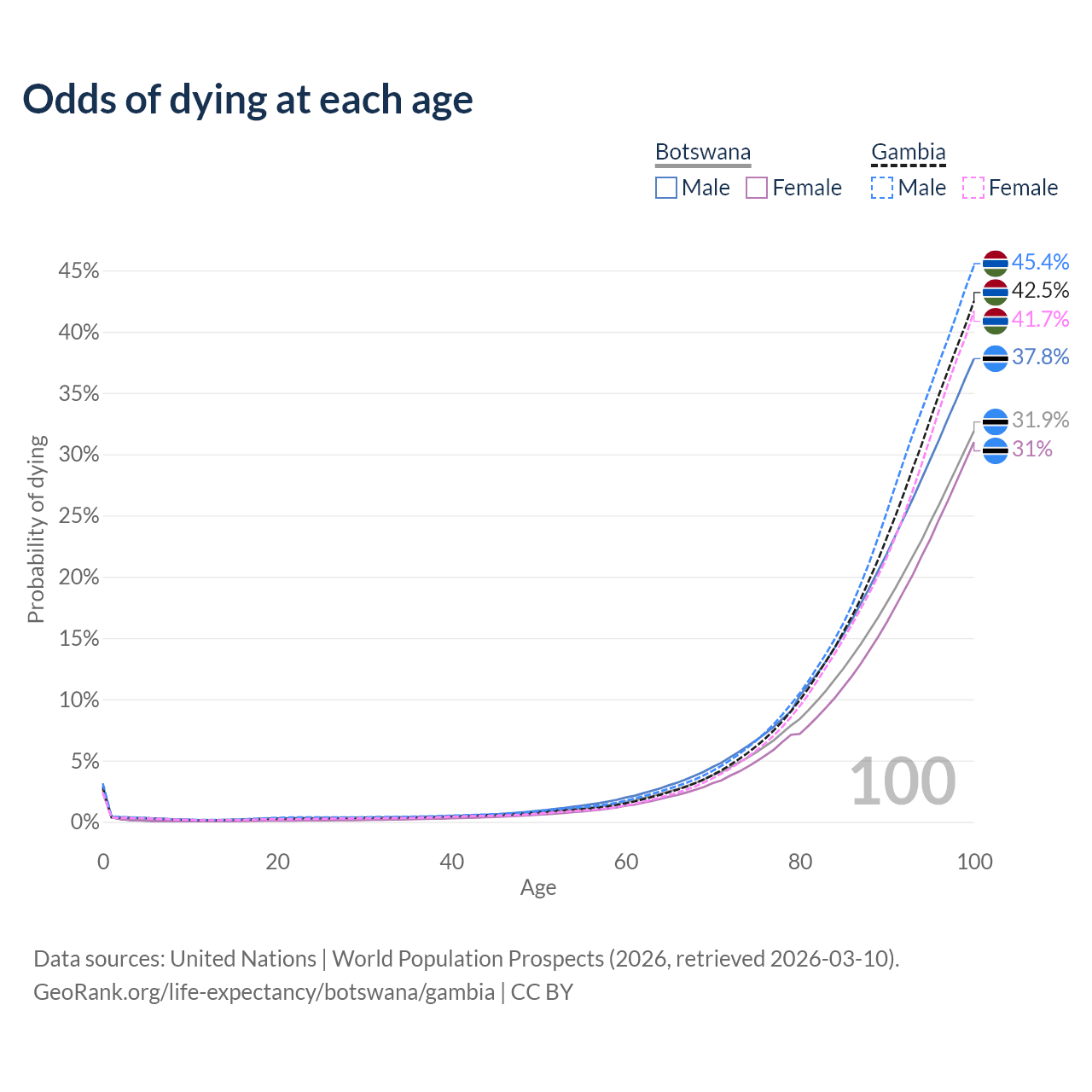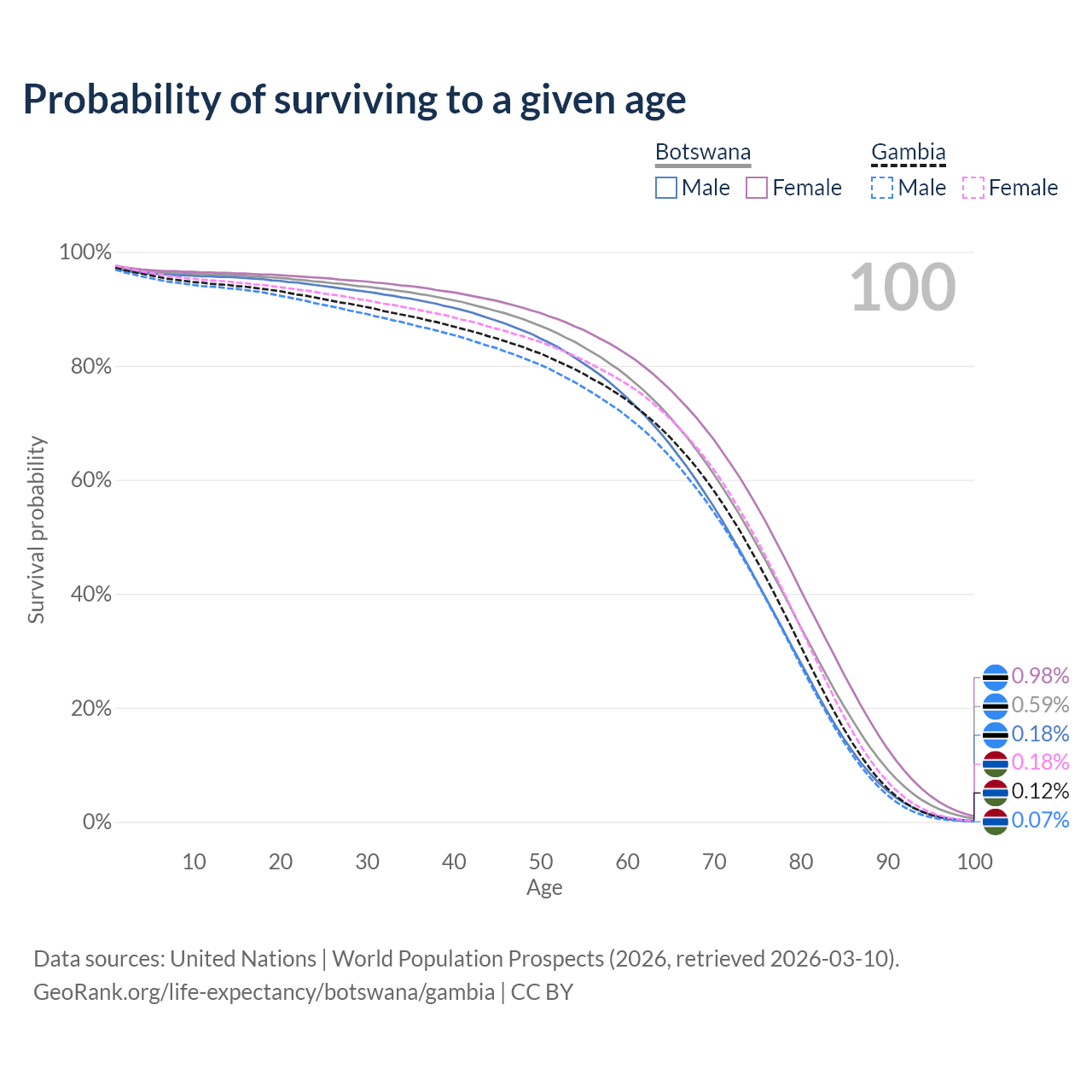 This life expectancy calculator shows the odds of living to 100, 95, 90, and below based on current age for both males and females in Botswana and the Gambia, along with mean and median age of death. The calculations are based on the 2026 life tables (actuarial tables) from the UN World Population Prospects.