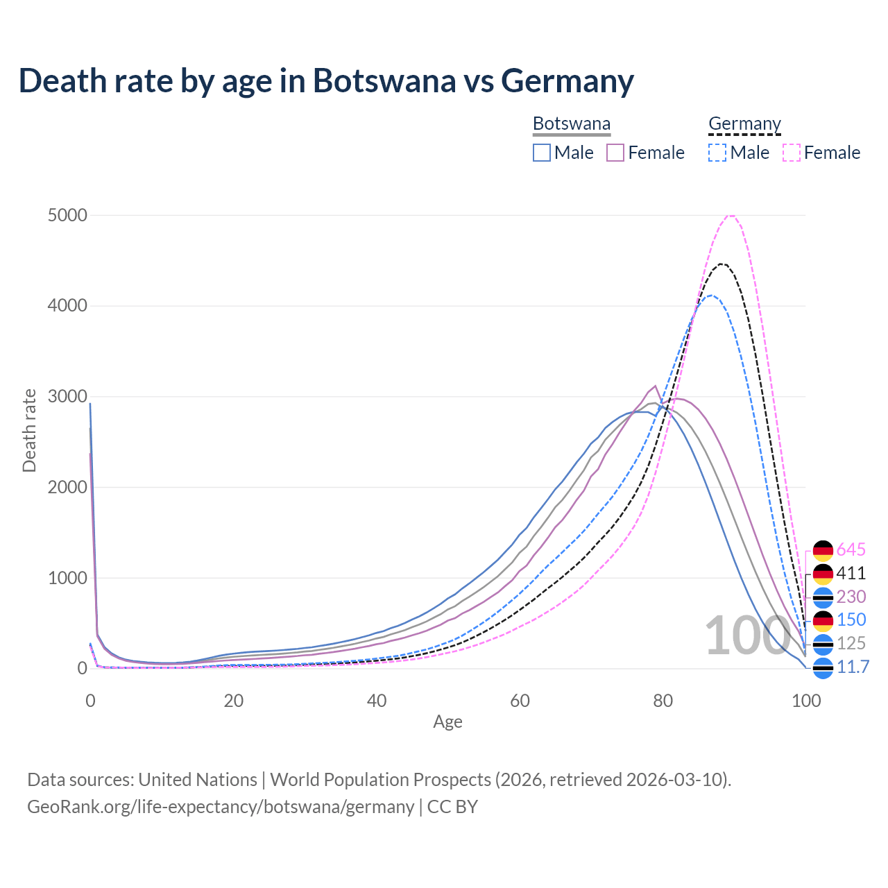 Note that this chart does not show rates per 100,000 population, as those would be skewed by age structure differences and reflect the demographics of Botswana and Germany more than their death rates.
