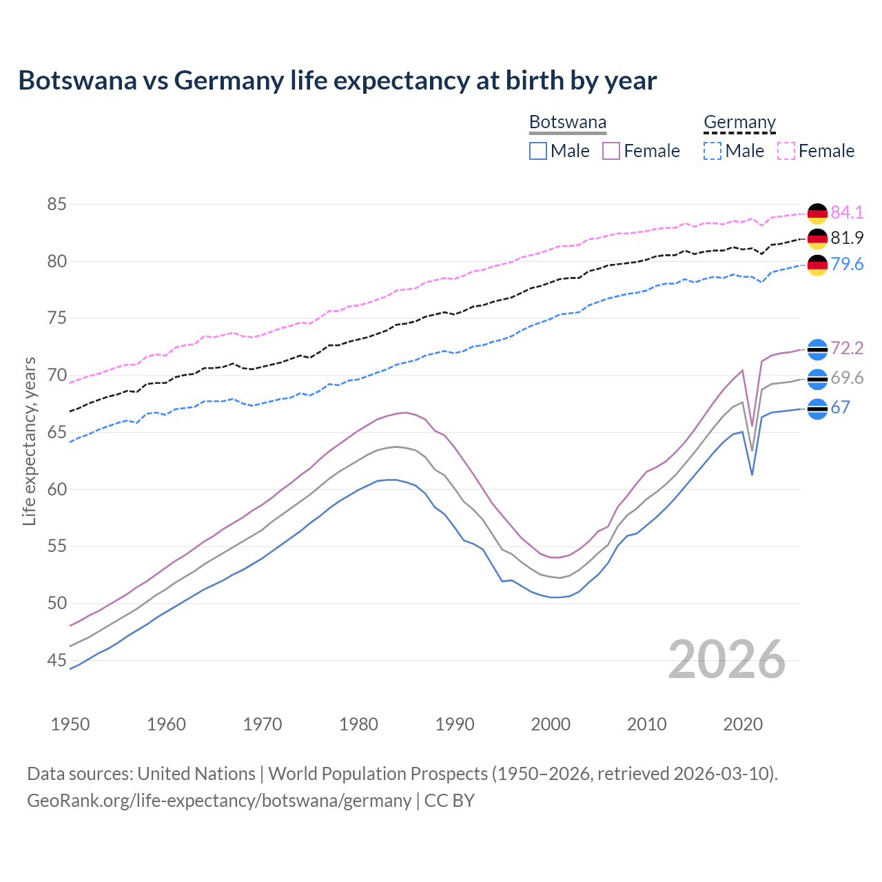 The average life expectancy at birth is 69.6 years in Botswana vs 81.9 in Germany. Botswana is ranked 141/197 by life expectancy, and Germany is 34/197. In Botswana, the life expectancy is 67 years for males and 72.2 years for females. In Germany, it's 79.6 years for males and 84.1 years for females.