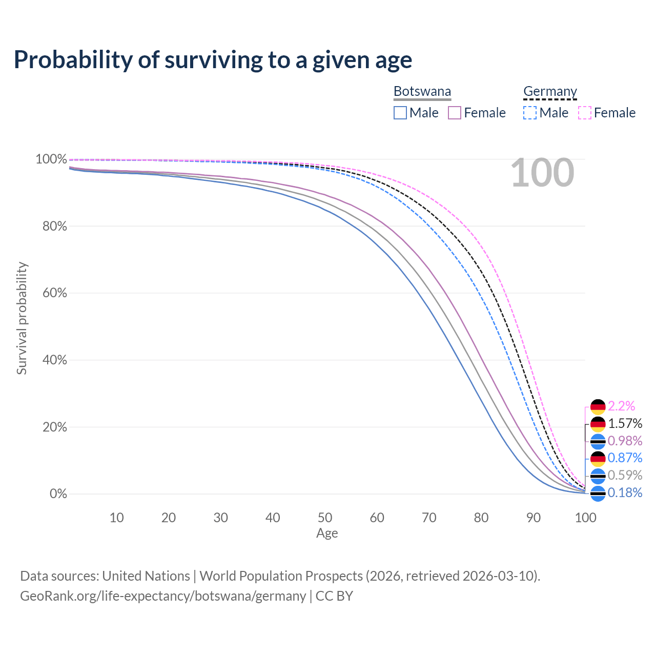 This life expectancy calculator shows the odds of living to 100, 95, 90, and below based on current age for both males and females in Botswana and Germany, along with mean and median age of death. The calculations are based on the 2026 life tables (actuarial tables) from the UN World Population Prospects.