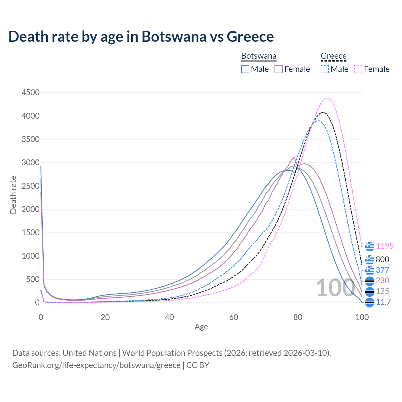 In Botswana, the most common age of death is 79, compared to 88 in Greece. The median age of death is 74.4 in Botswana and 84.9 in Greece, meaning only half of each cohort is expected to live past that age.