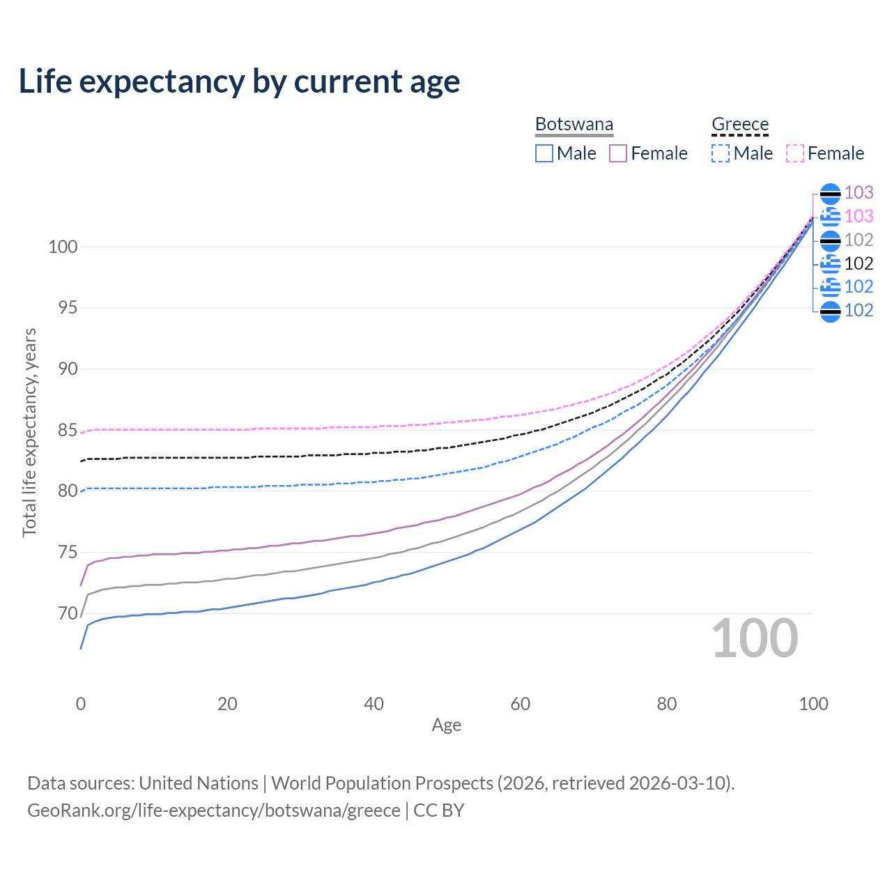 This life expectancy calculator shows the odds of living to 100, 95, 90, and below based on current age for both males and females in Botswana and Greece, along with mean and median age of death. The calculations are based on the 2026 life tables (actuarial tables) from the UN World Population Prospects.
