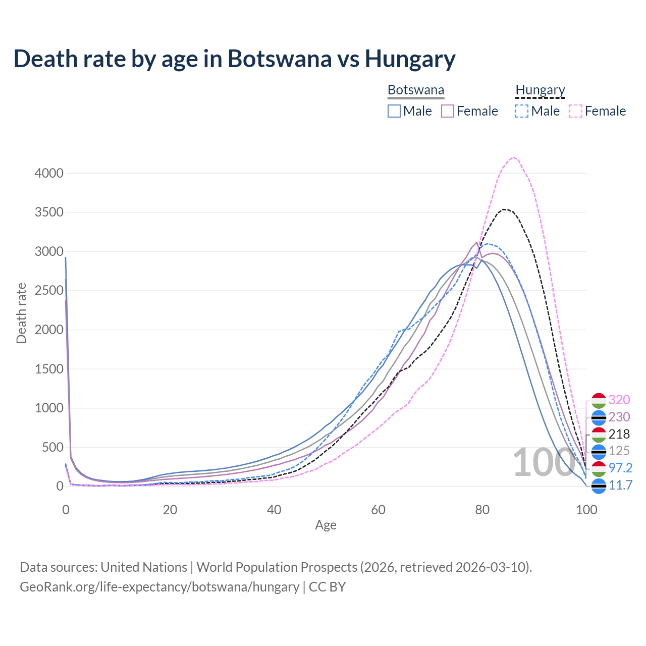 In Botswana, the most common age of death is 79, compared to 84 in Hungary. The median age of death is 74.4 in Botswana and 80.4 in Hungary, meaning only half of each cohort is expected to live past that age.