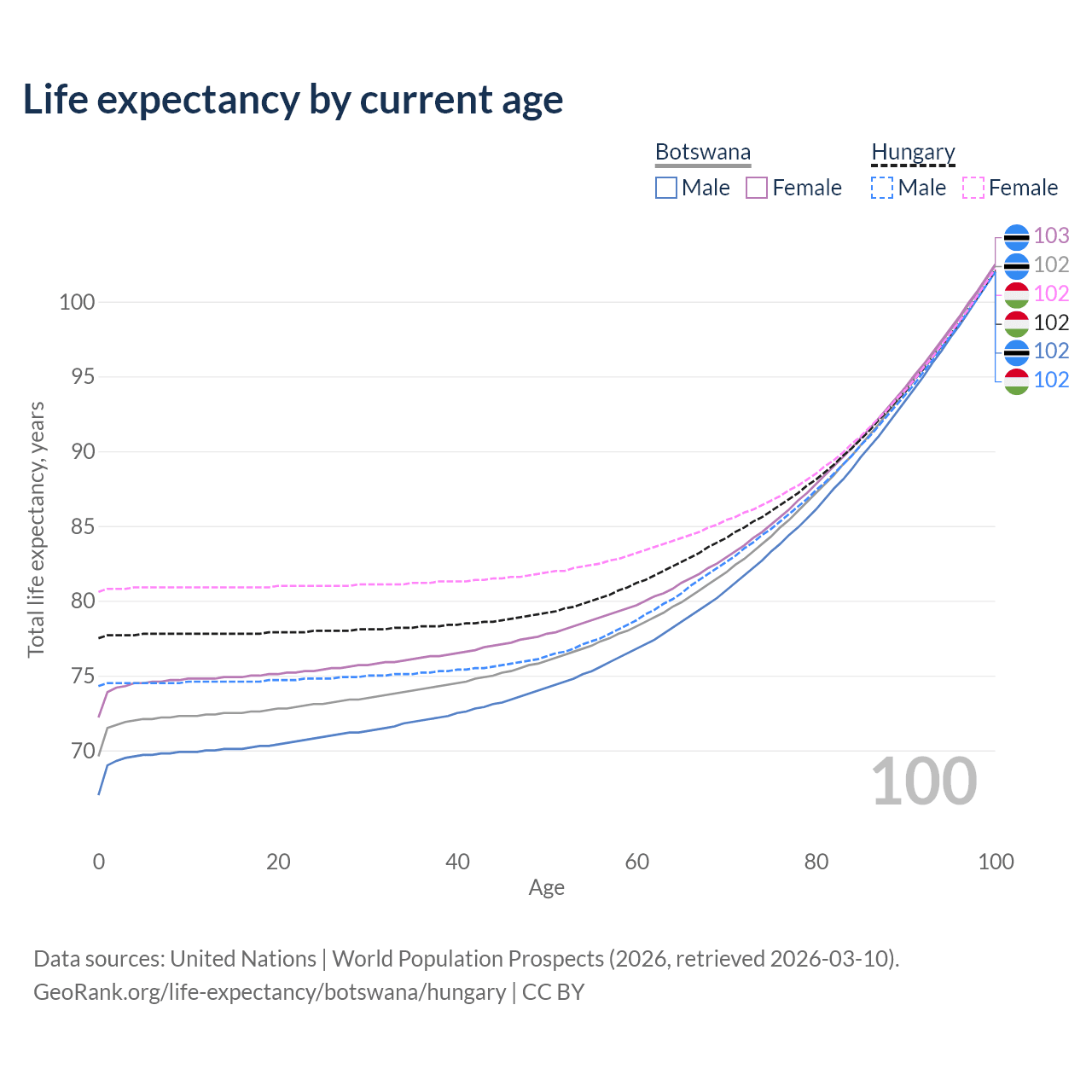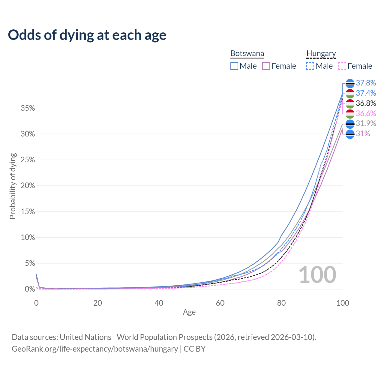This life expectancy calculator shows the odds of living to 100, 95, 90, and below based on current age for both males and females in Botswana and Hungary, along with mean and median age of death. The calculations are based on the 2026 life tables (actuarial tables) from the UN World Population Prospects.
