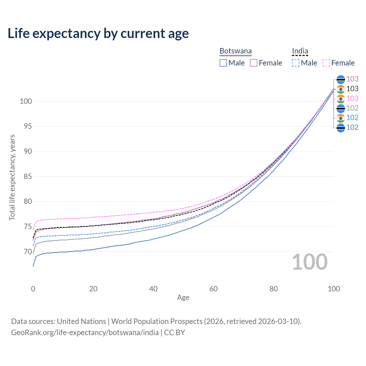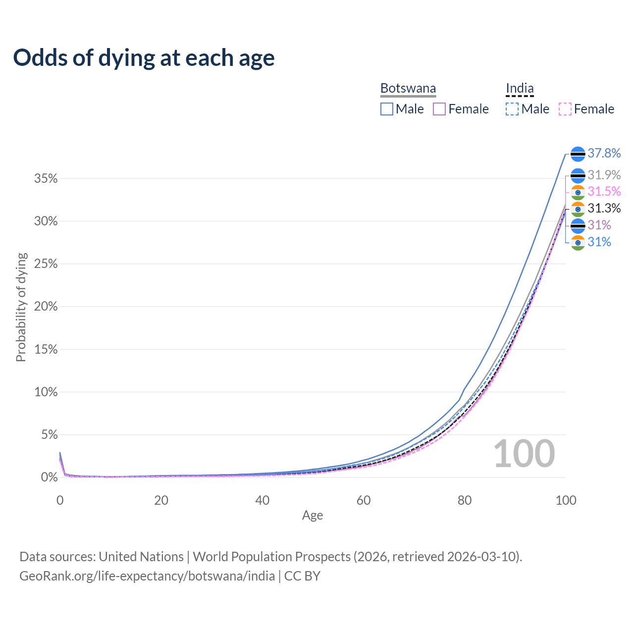 This life expectancy calculator shows the odds of living to 100, 95, 90, and below based on current age for both males and females in Botswana and India, along with mean and median age of death. The calculations are based on the 2026 life tables (actuarial tables) from the UN World Population Prospects.