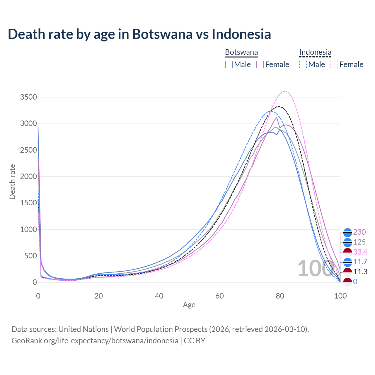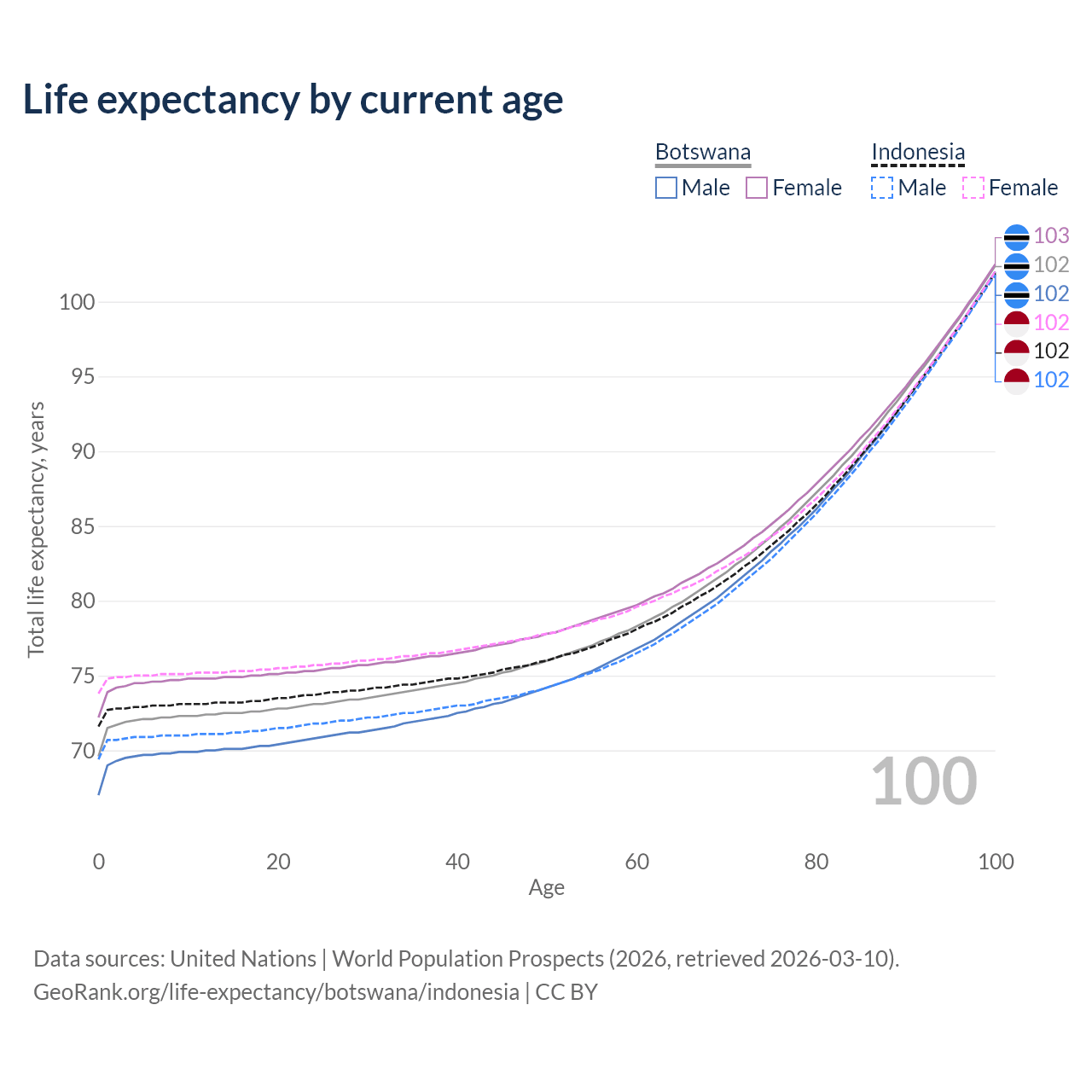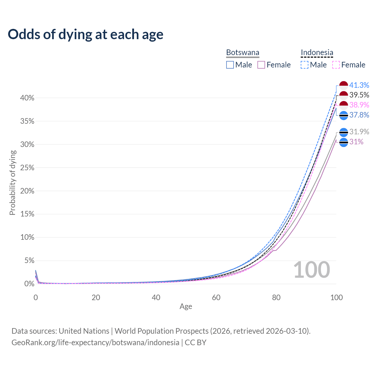 This life expectancy calculator shows the odds of living to 100, 95, 90, and below based on current age for both males and females in Botswana and Indonesia, along with mean and median age of death. The calculations are based on the 2026 life tables (actuarial tables) from the UN World Population Prospects.